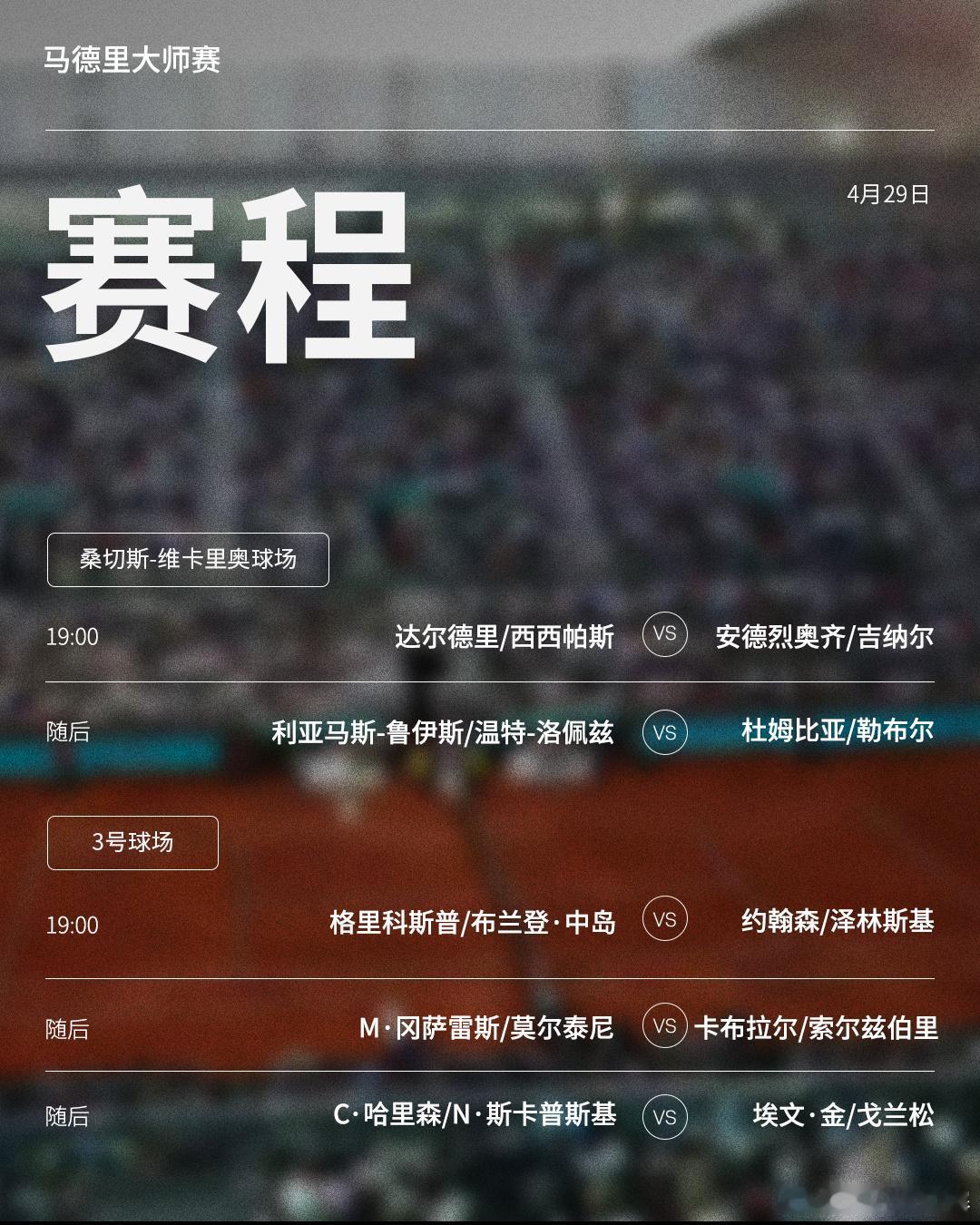 ATP1000 马德里大师赛周三赛程如下(均为北京时间)👀