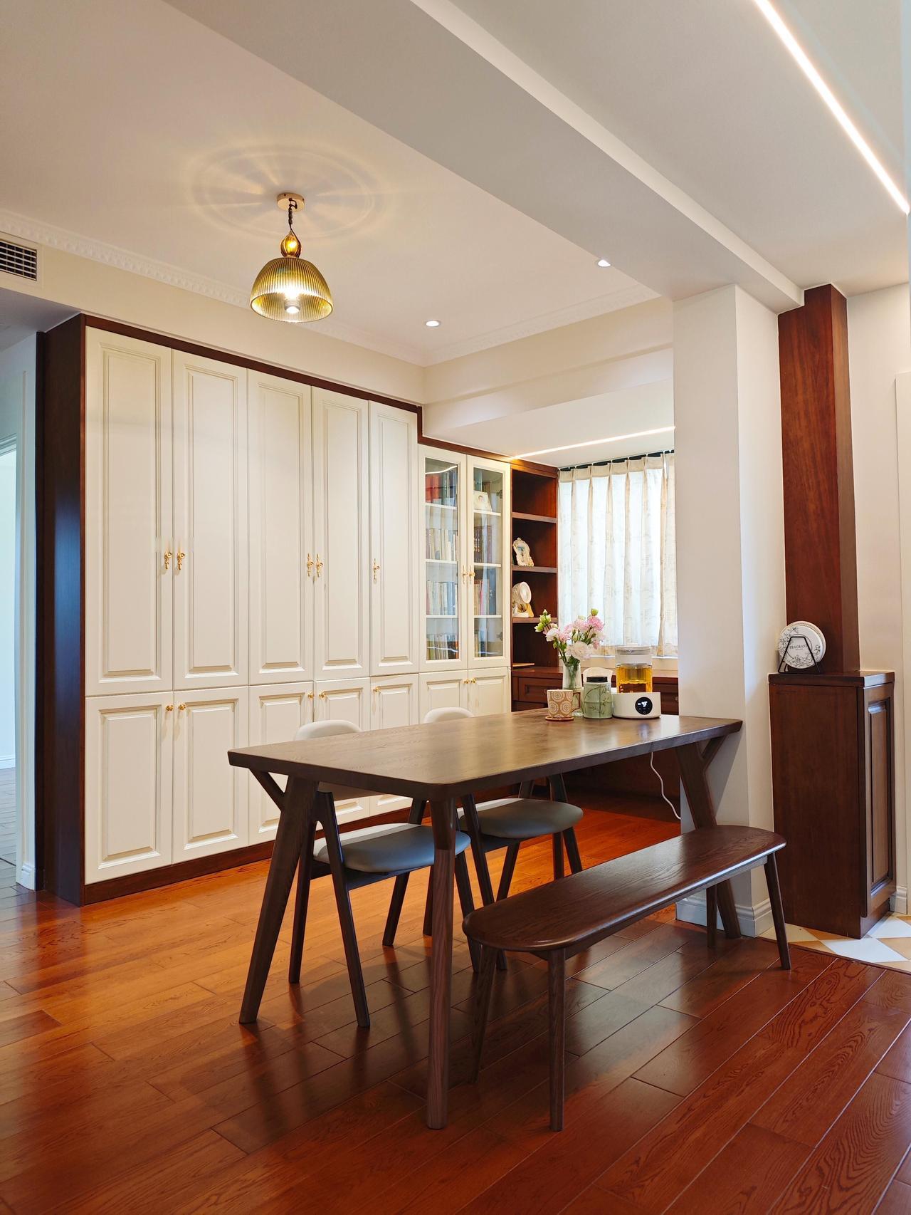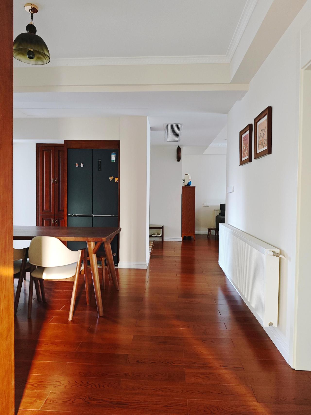 全屋通铺木地板,孩子们光着脚在家跑来跑去,冬天不会凉,软硬也合适,墙面没搞花哨的壁纸或岩板,就全部刷了乳胶漆,清爽利落。