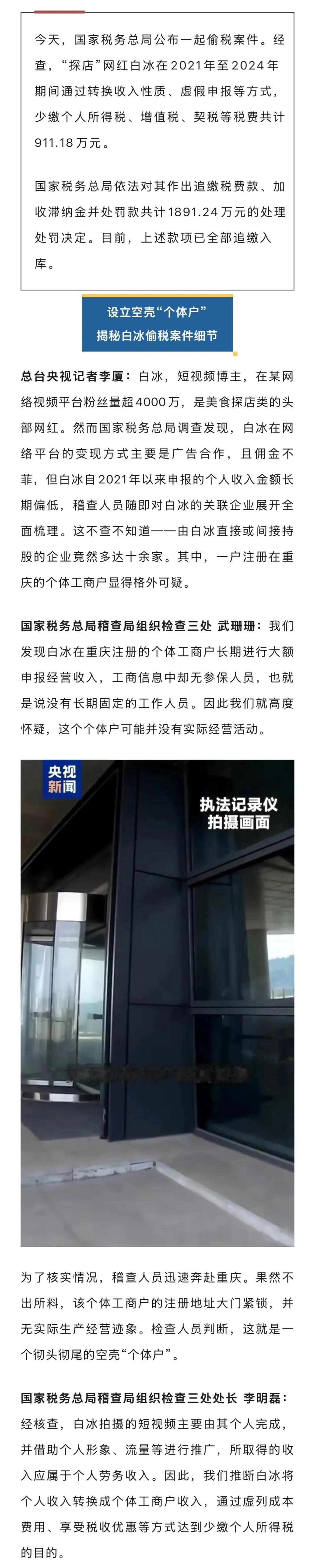 白冰偷税案,官方通报得很清楚。经查,白冰在2021年至2024年期间,通过转换收入性质、虚假申报等方式,少缴个人所得税、增值税、契税等共计911.18万元。