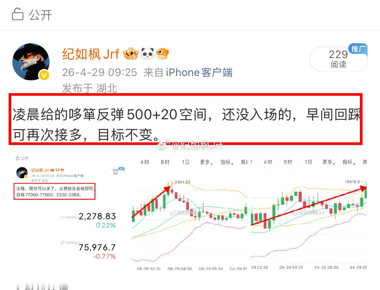 现报76800/2300附近,不管是凌晨75900附近接的,还是早间回踩76000附近接的,目前都有空间。