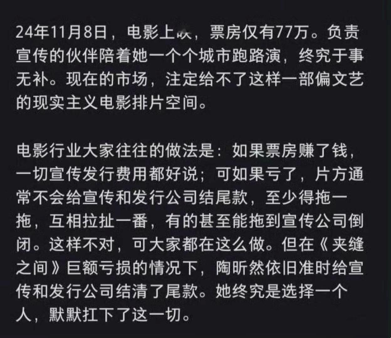 陶昕然自掏腰包给亏损电影结尾款24年的一部电影《夹缝之间》面临巨额亏损的情况下,