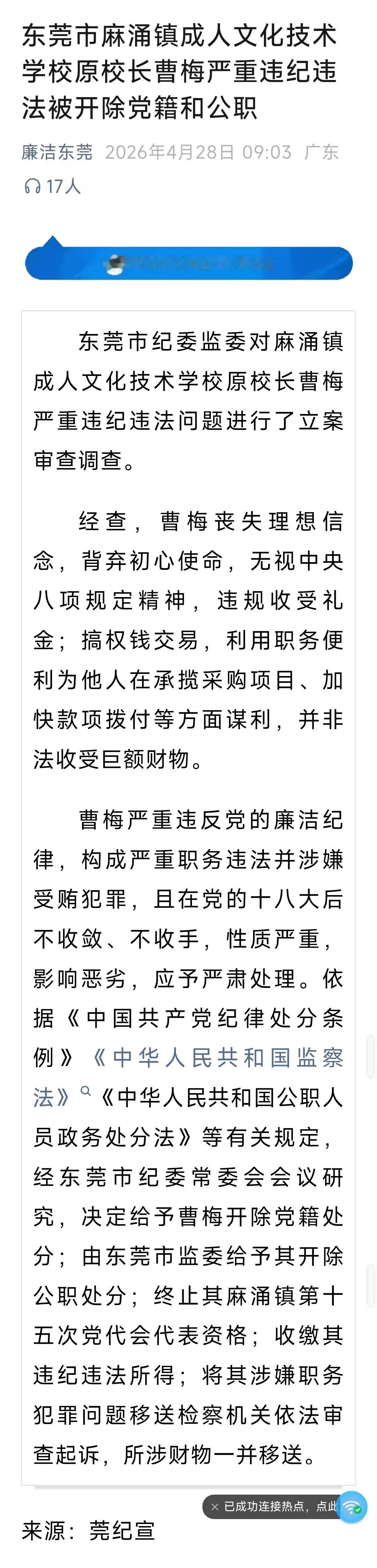 2026年4月28日09:03,廉洁东莞官微发布了一则重要通报,东莞市麻涌镇成人文化技术学校原校长曹梅严重违纪违法被开除党籍和公职。