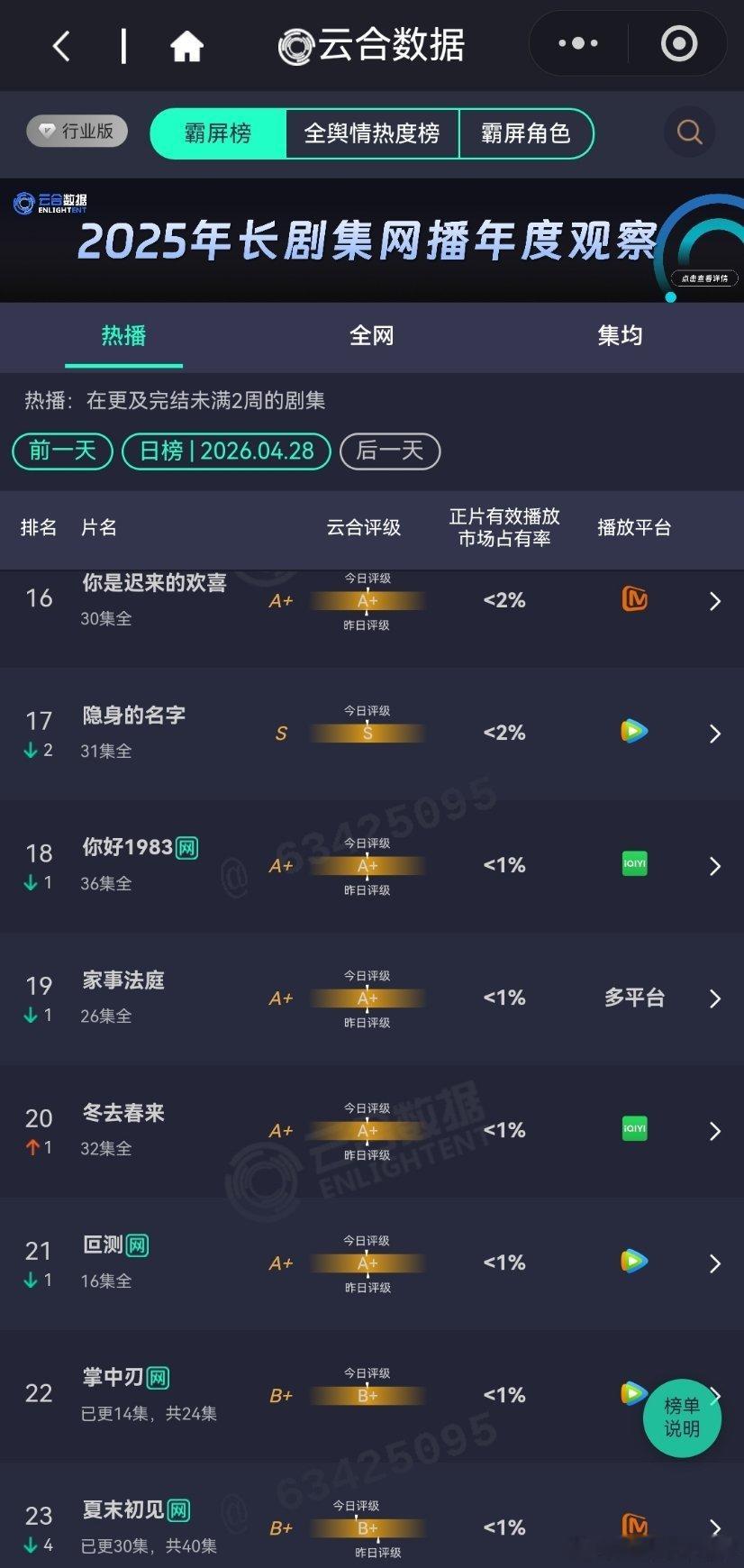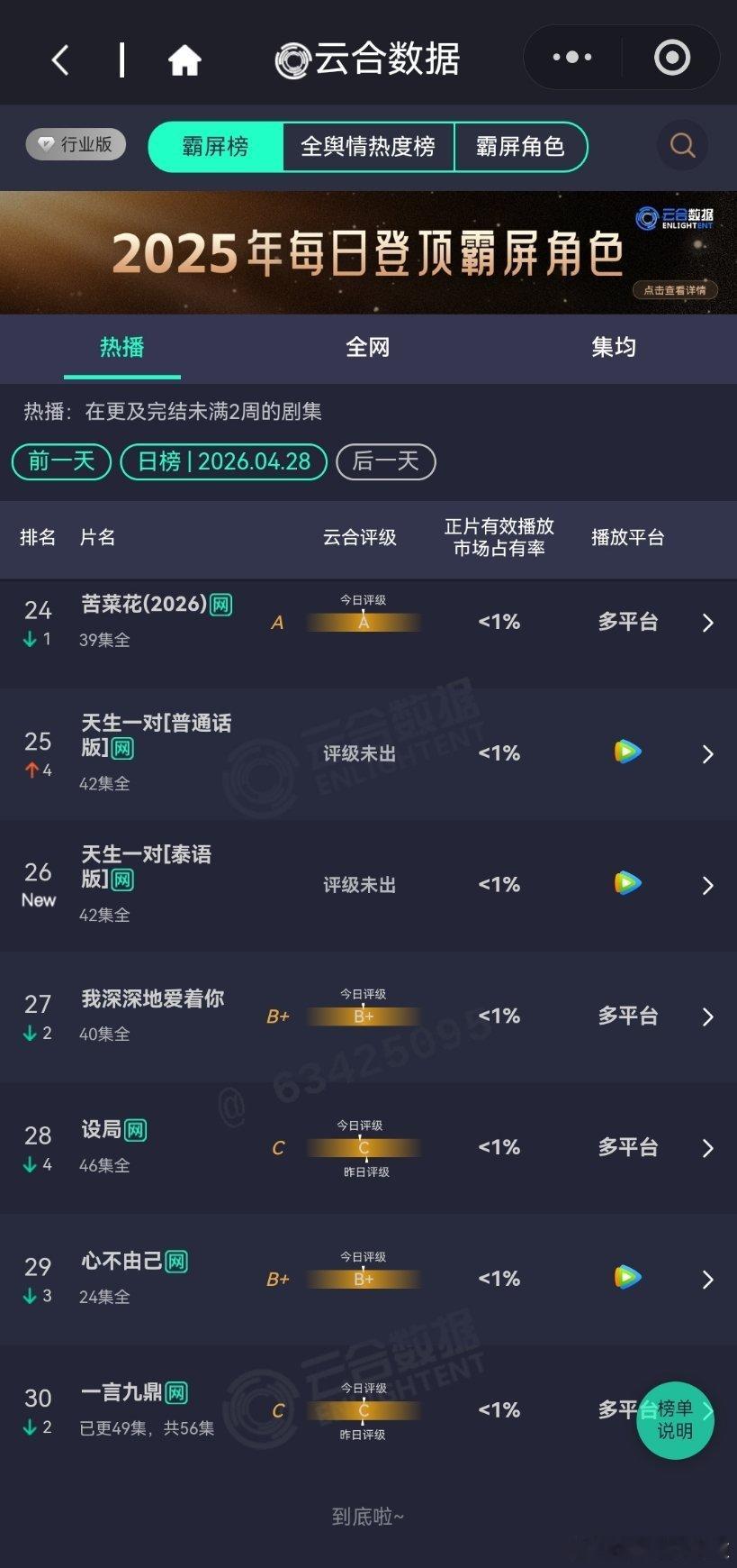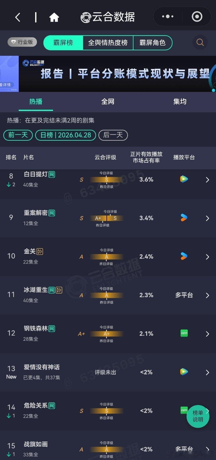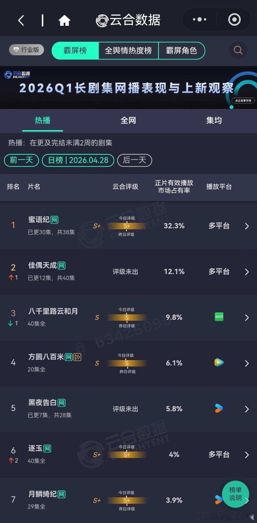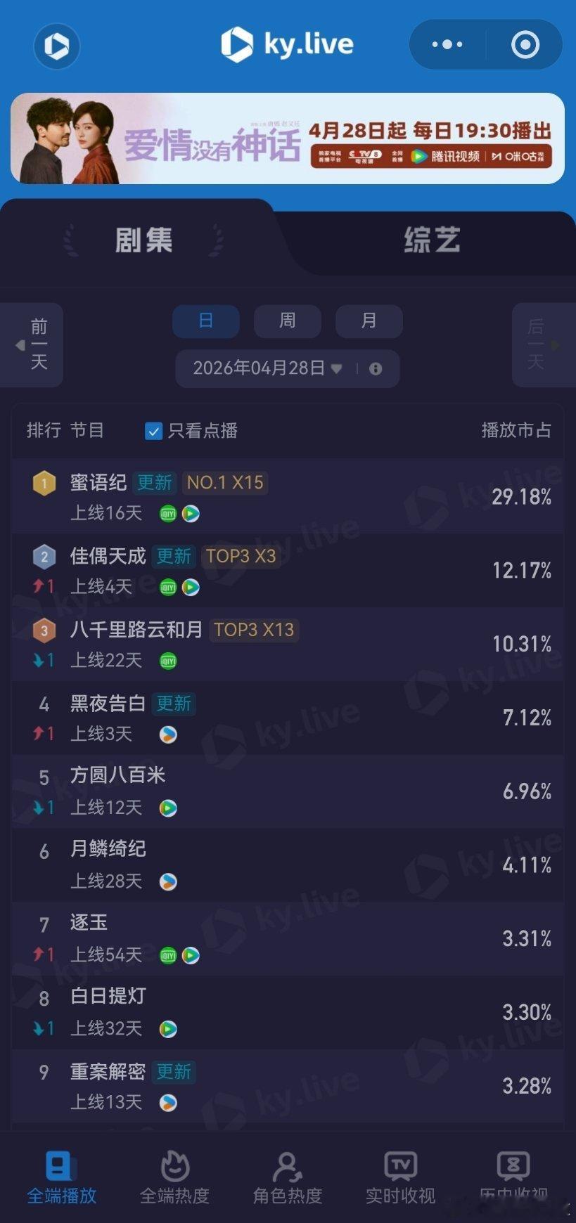 4月29日云合播放占比云合 VS酷云蜜语纪云合32.3%,酷云29.18%佳偶天成云合12.1%,酷云12.17%越来越好了,排名第二。黑夜告白云合5.8%,酷云7.12%横盘趋势。