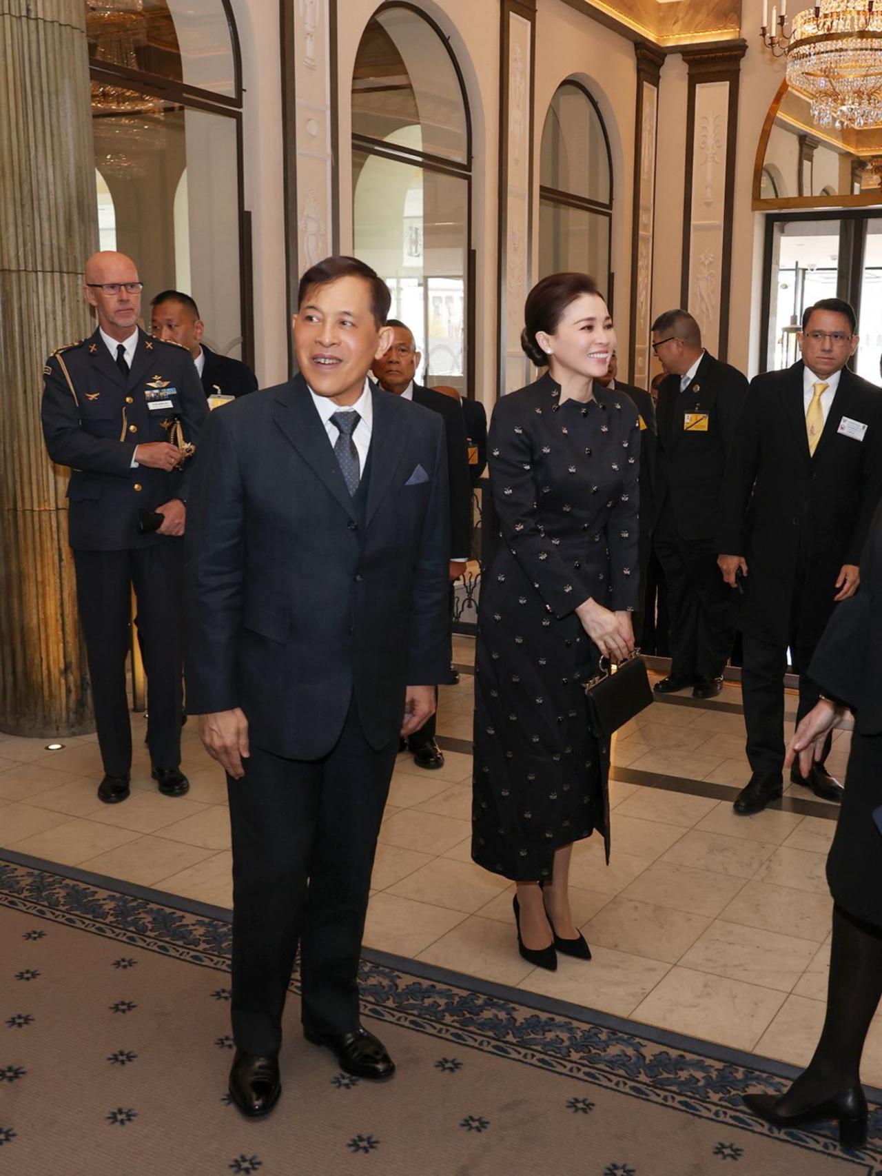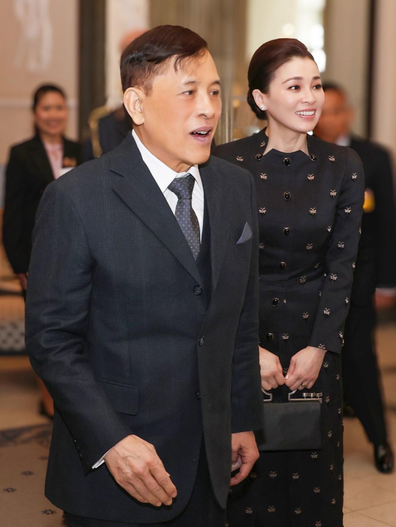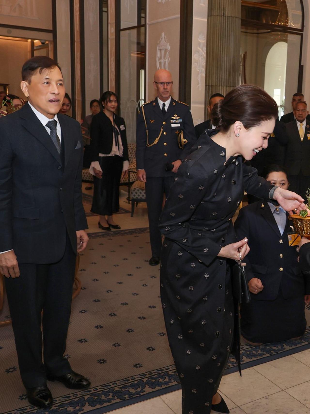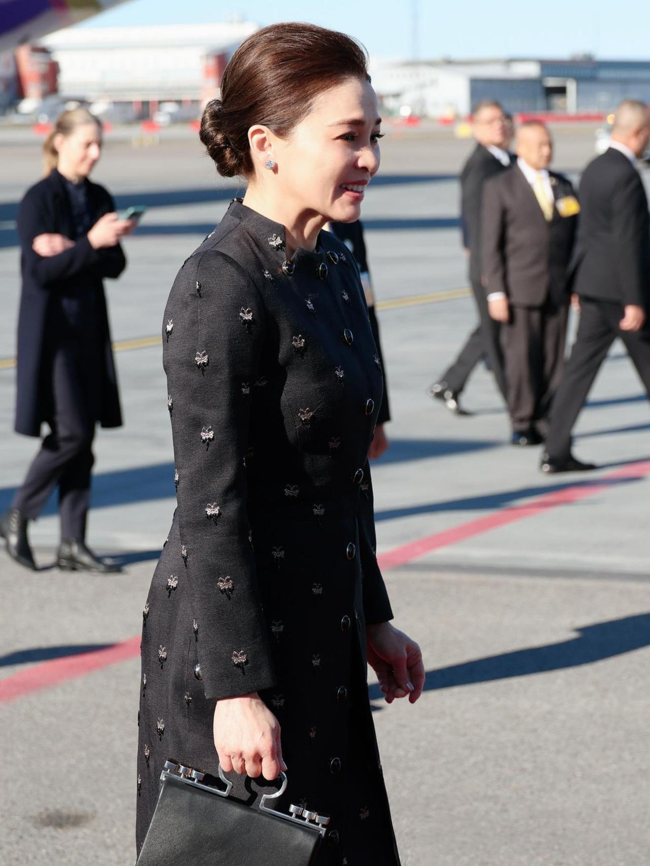 裙子上手工刺绣的黑色珠子和水晶,低调又闪亮,把简约和现代优雅结合得恰到好处。她手上拎的羊皮手提包也超有亮点,银色手柄上有烟晶装饰,既展现了泰国独特的传统手工艺,又透着现代时尚感,这可是Wasin Thai Textile公司织造的呢,王后这一身搭配,简直绝了!