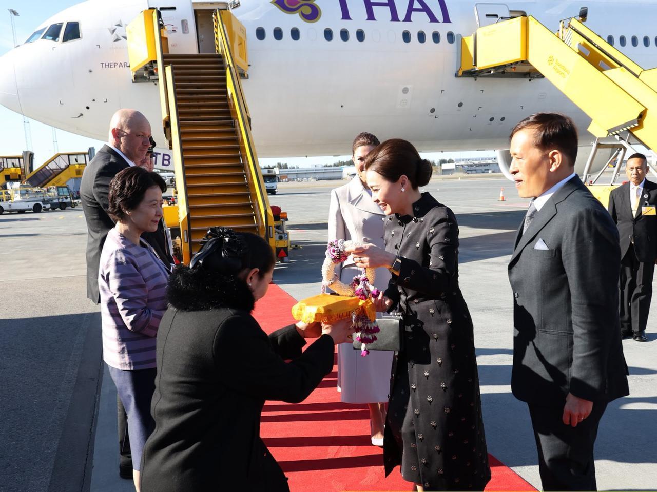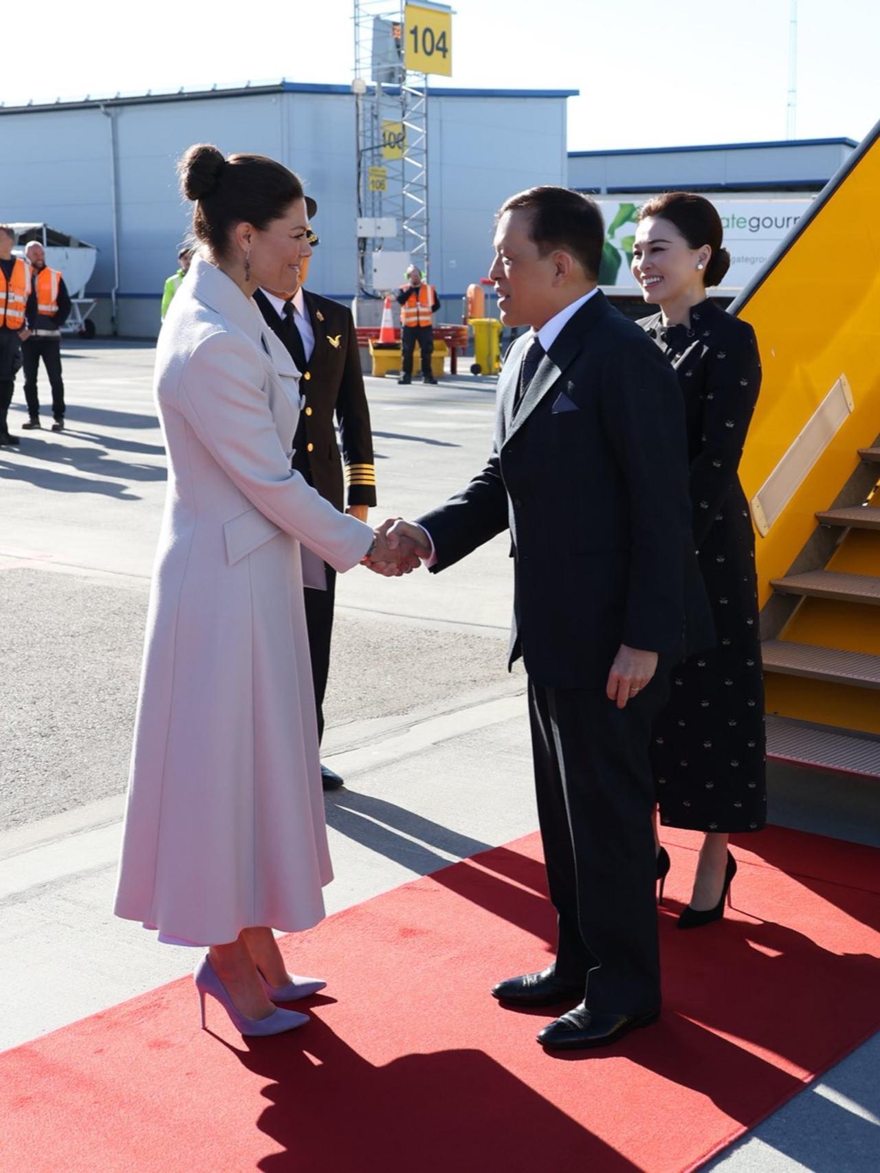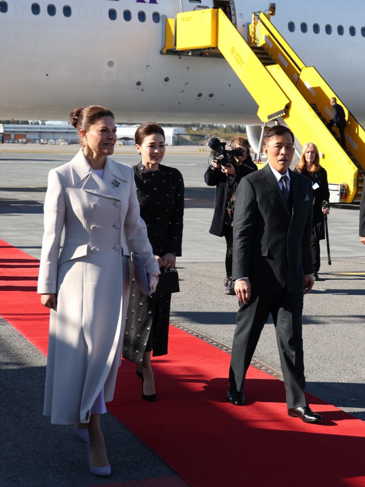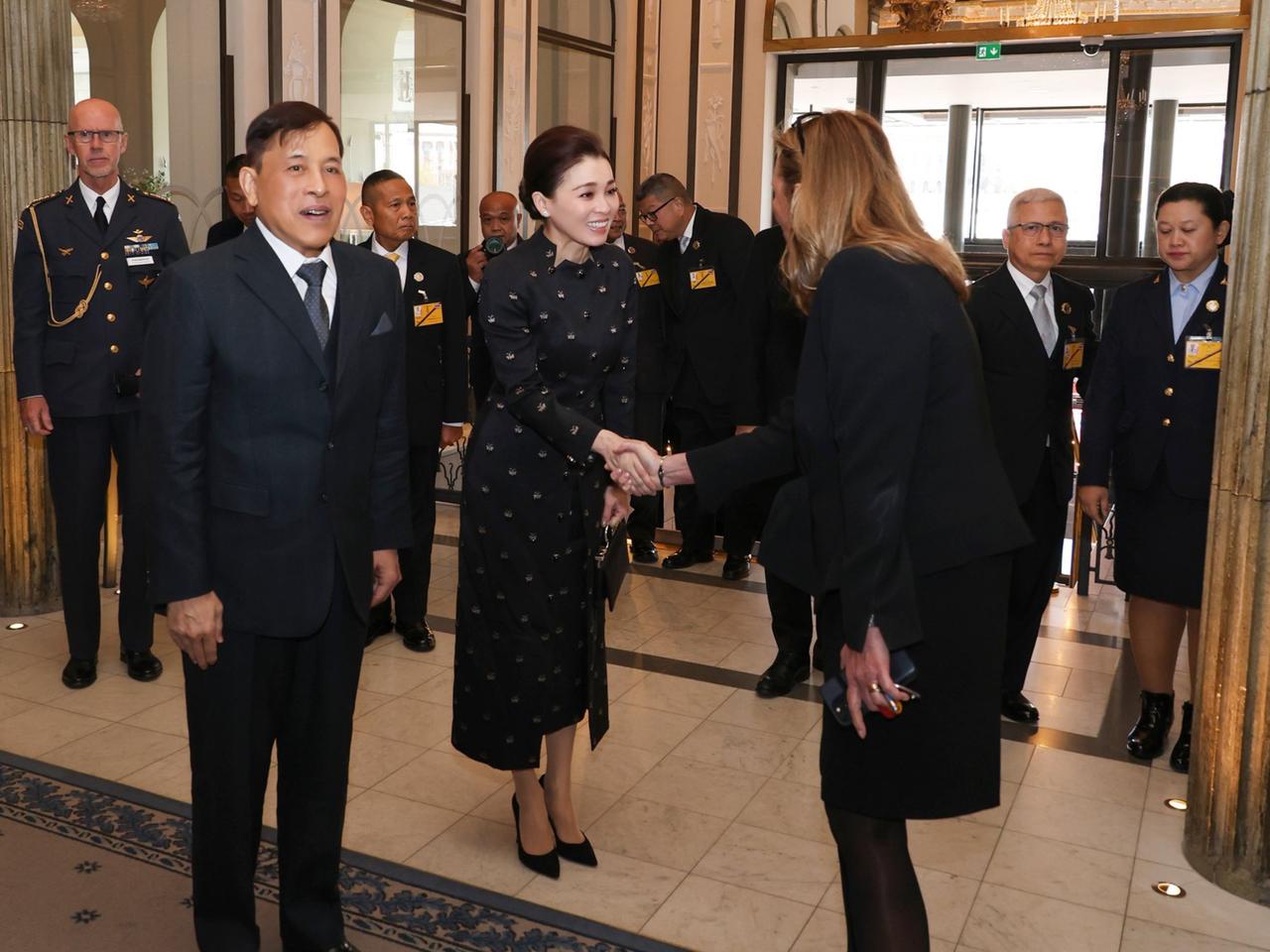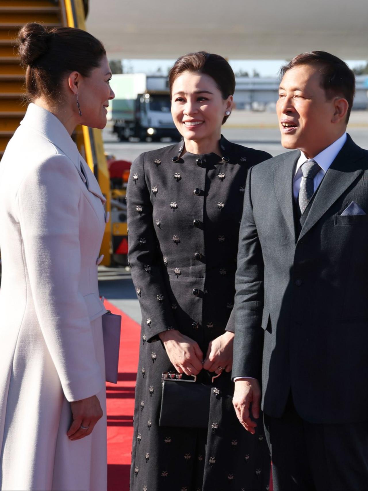 裙子上手工刺绣的黑色珠子和水晶,低调又闪亮,把简约和现代优雅结合得恰到好处。她手上拎的羊皮手提包也超有亮点,银色手柄上有烟晶装饰,既展现了泰国独特的传统手工艺,又透着现代时尚感,这可是Wasin Thai Textile公司织造的呢,王后这一身搭配,简直绝了!