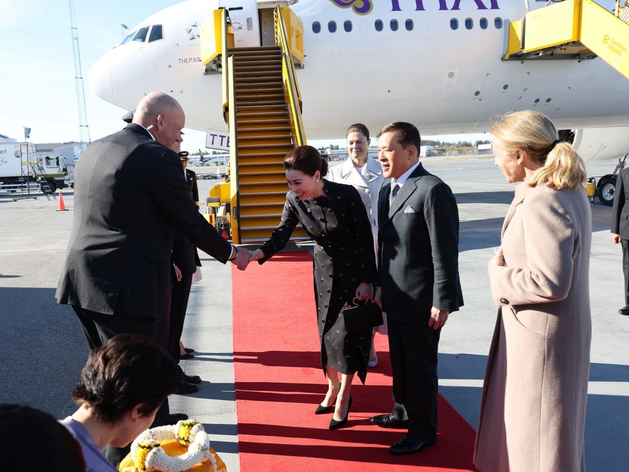 苏提达王后访问瑞典,那叫一个美出新高度!她穿了件黑色长袖直筒连衣裙,剪裁超利落,领口和前襟有镶嵌缟玛瑙的银扣,精致得很。里面还搭了同色系的丝绸裙,面料是南奔府特产的蝴蝶图案南奔锦缎,古银色丝线织就,质感满满。
