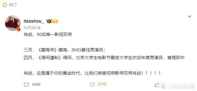 肖战一年两部作品影视双收肖战眼眶湿润《藏海传》和《得闲谨制》肖战影视双收!肖战值得,肖战全肯定,恭喜90后唯一影视双帝肖战👏 发表获奖感言时肖战眼眶湿润一步一个脚印走到今天,肖战值得所有的荣誉