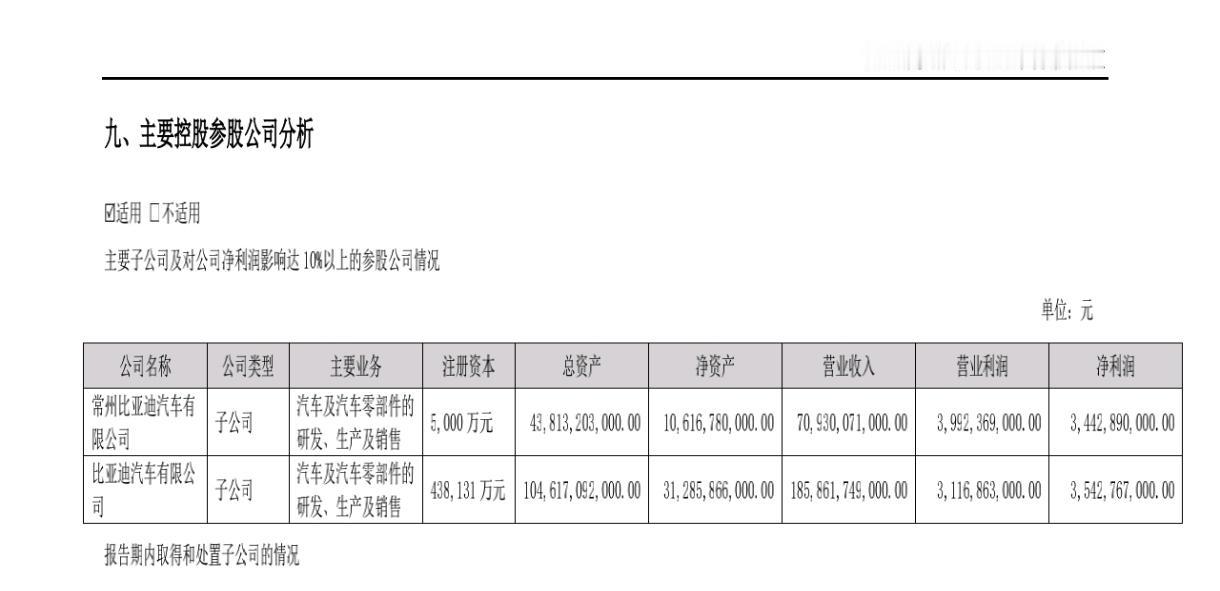 比亚迪2025年度的财务报告披露了常州比亚迪、西安比亚迪两家子公司2025年度的经营业绩(因这两个子公司对利润贡献占比10%以上,需按要求列明)。