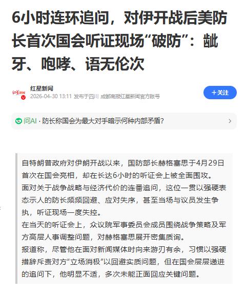 4月29日,赫格塞思去国会参加听证会,这是他自2月底美国对伊朗开战以来第一次公开接受质询,结果这场听证会开了整整6个小时,成了他的“批斗大会”。