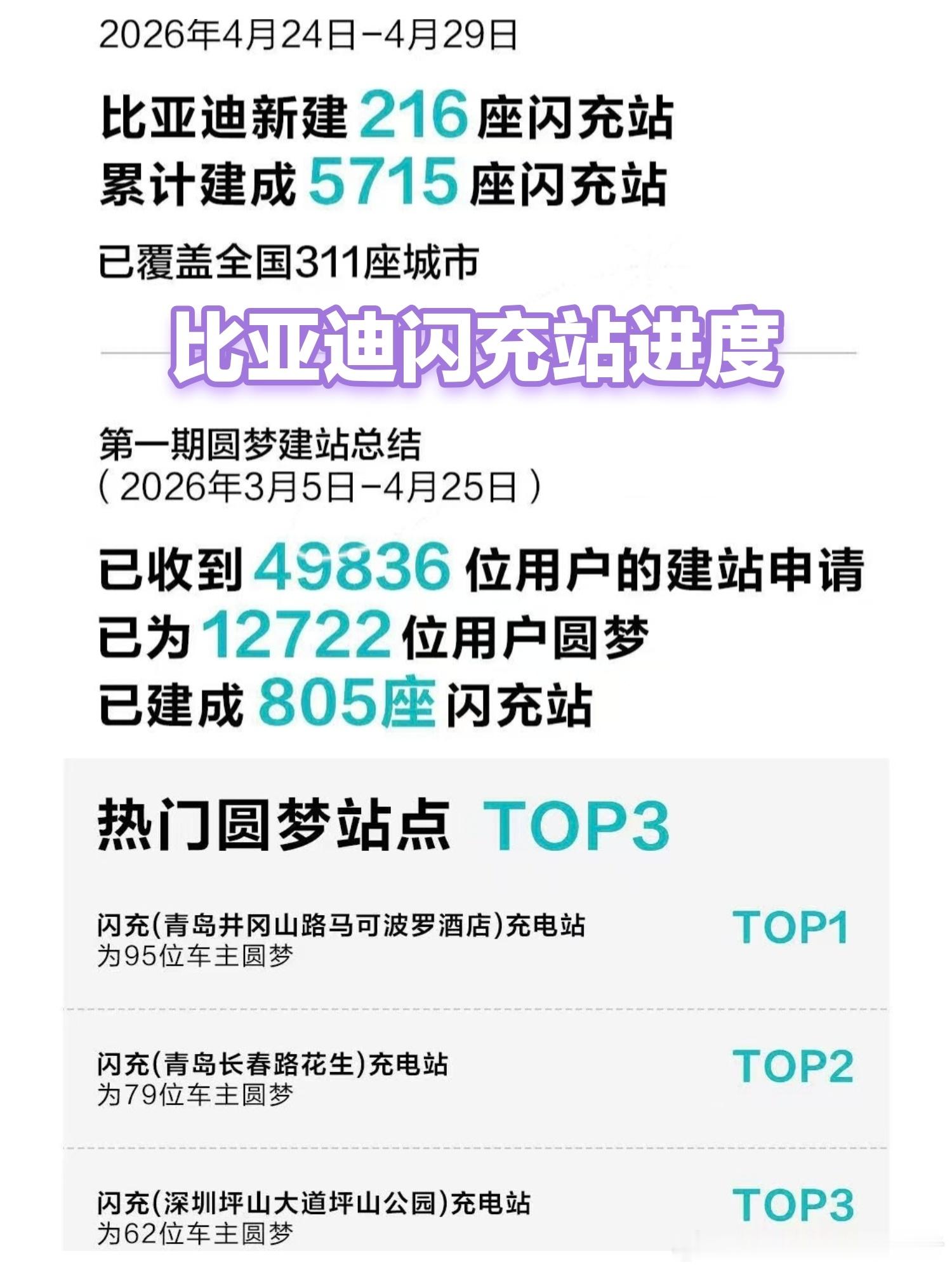 4月26日至4月29日,比亚迪新建设216座闪充站,已经覆盖311座城市。从3月5日到4月25日,已经收到49836位用户的建站申请;目前以为12722位用户圆梦,已经建成805座闪充站。
