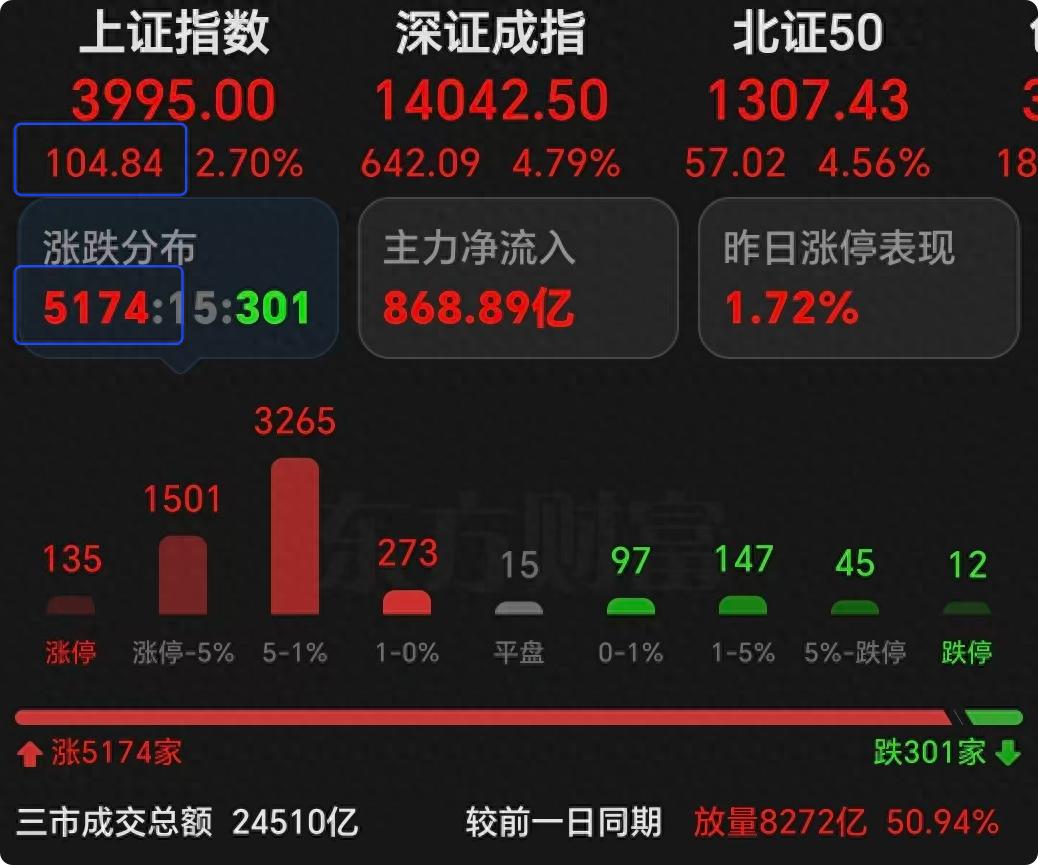 今日A股迎来史诗级爆发,百点长阳强势拉升,指数直逼4000点关口,创业板指数更是狂涨6%,盘面一片红热,近5200只个股