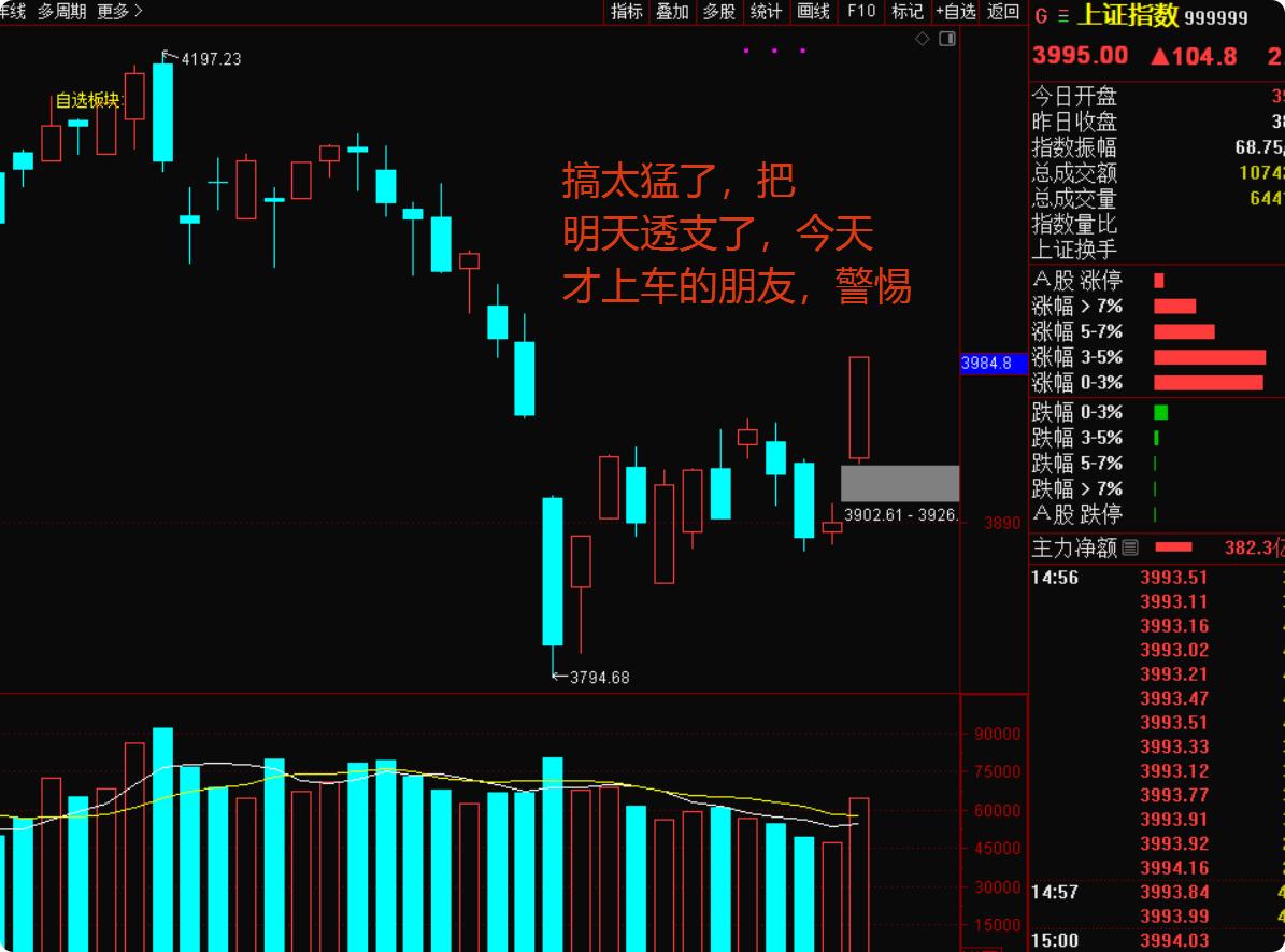我的观点直接明了,不绕弯子:今天行情涨得太猛,大家都进场了,不利于真正的上涨,明天大概率会出现高开低走的小调整,没有提前做好预判,盘面绝对不会让你好受,盲目追高只会得不偿失。