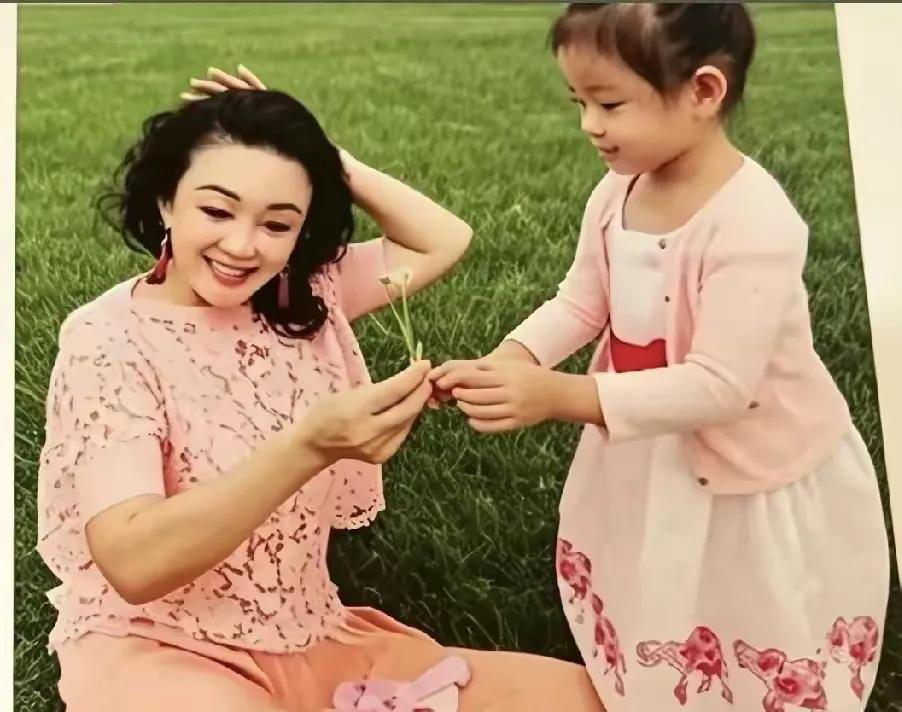 张兰披着大波浪,坐在草地上,小玥儿给奶奶送野花,猛一看像极了大S。