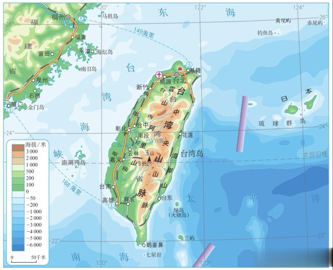 台湾省,西隔台湾海峡与福建省相望,东临太平洋,北濒东海,南界巴士海峡。