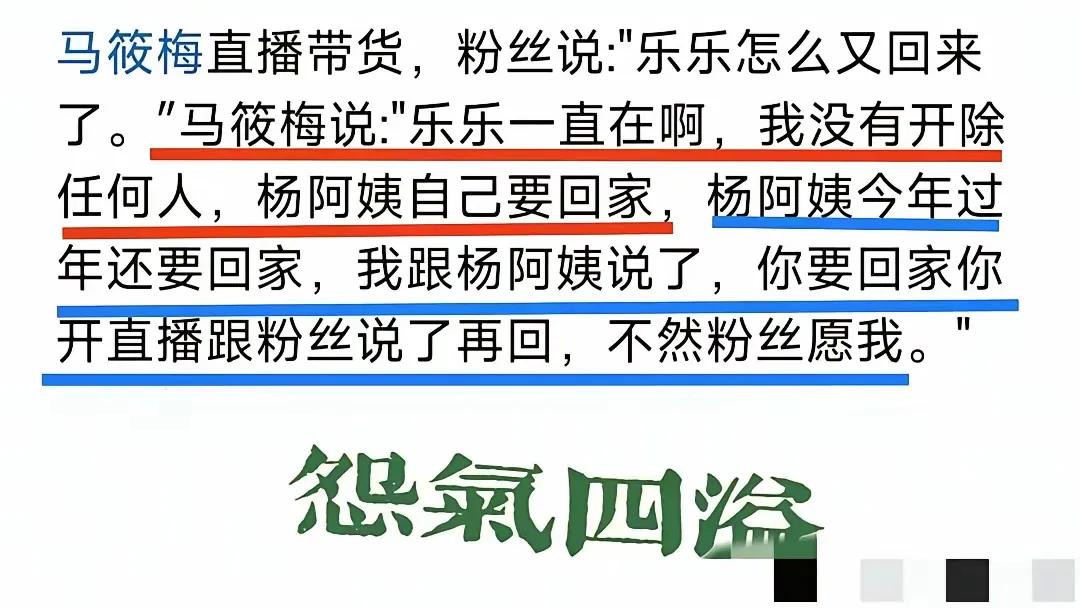 杨阿姨过年时自己要回家,不是被开除,筱梅表示自己已经与杨阿姨说了,你下次如果要回老家,开直播与粉丝说一下。