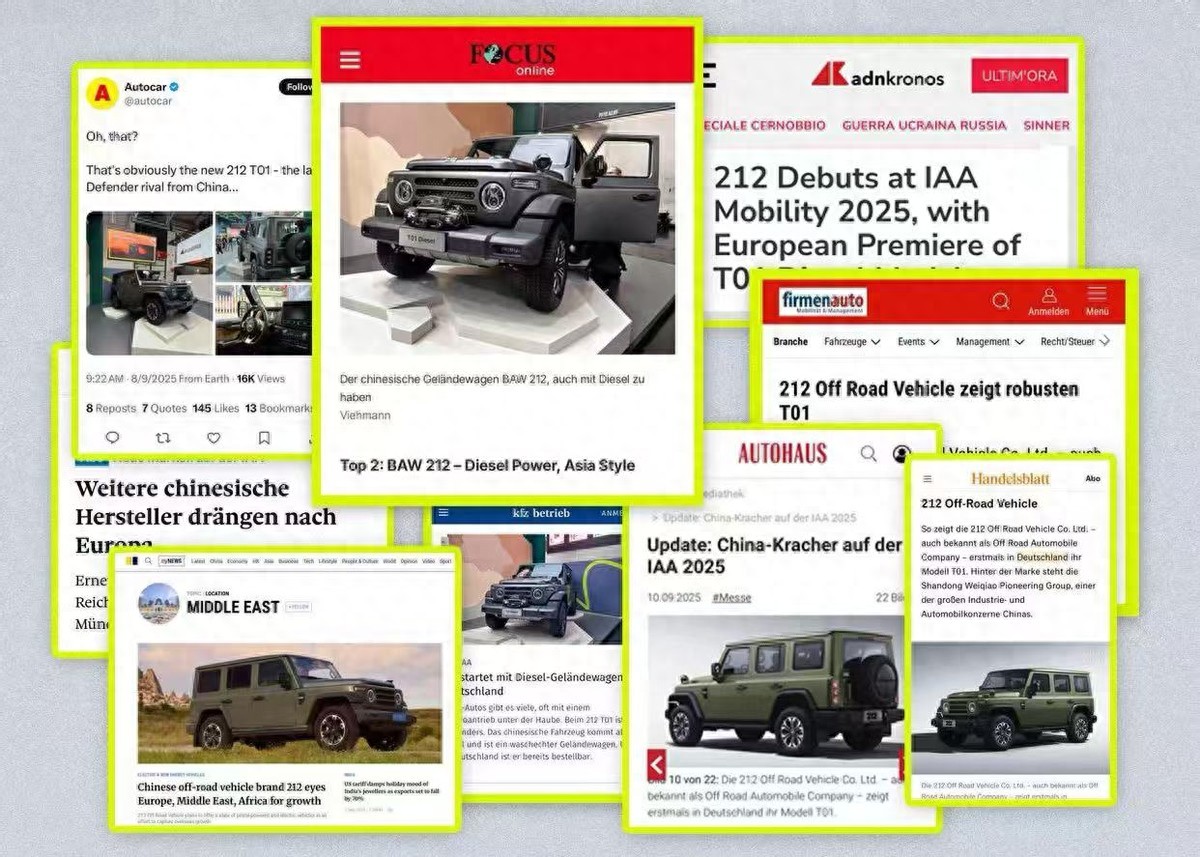 在海外,212越野车露出频次显著提升,先后登陆慕尼黑车展、SEMA改装展等国际展会。其T01柴油版车型被海外媒体频繁与奔驰G级、路虎卫士等车型对比,获得“中国卫士”的评价。德国《焦点》周刊将其评为该届慕尼黑车展“最热车型”第二位。在汽车工业底蕴深厚的德国市场,212越野车已获得超千台订单。
