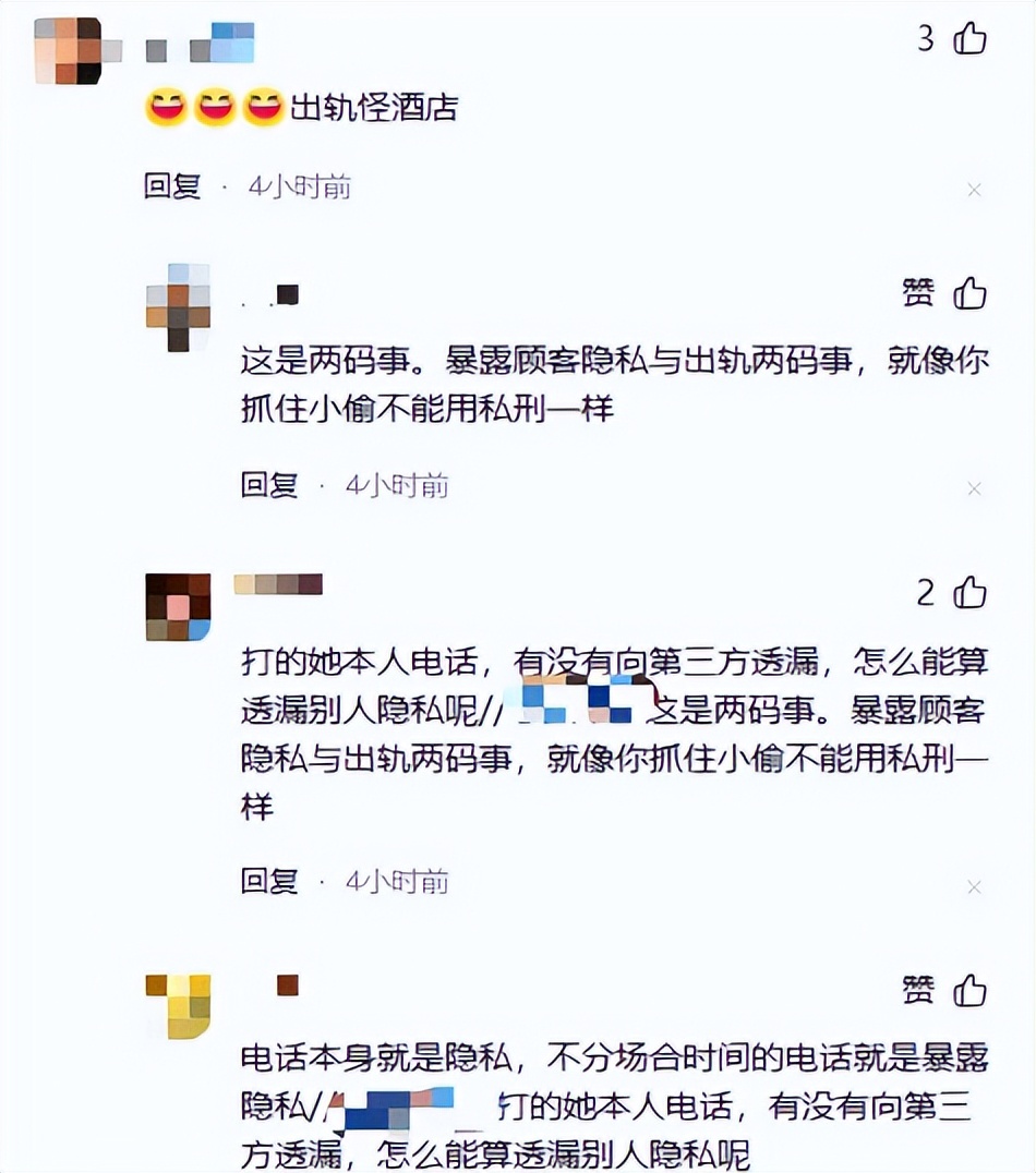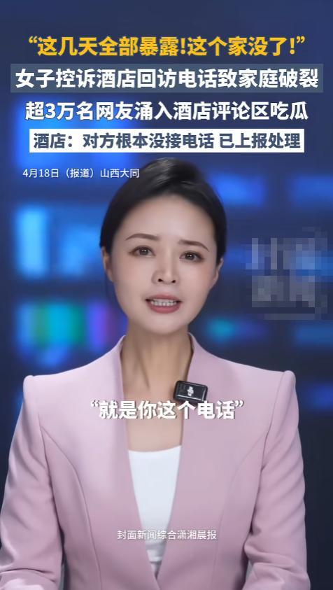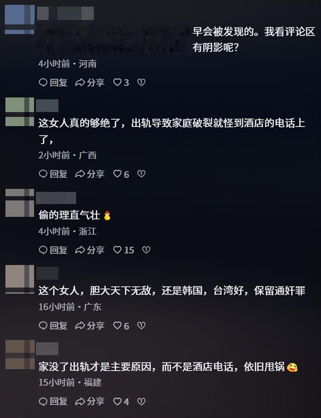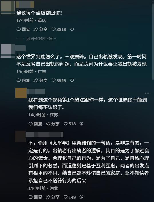 她没有丝毫反思自己的行为,没有意识到自己背叛婚姻、伤害家人是多么错误的事情,反而把所有的怨气和责任,都推到了涉事酒店的身上。