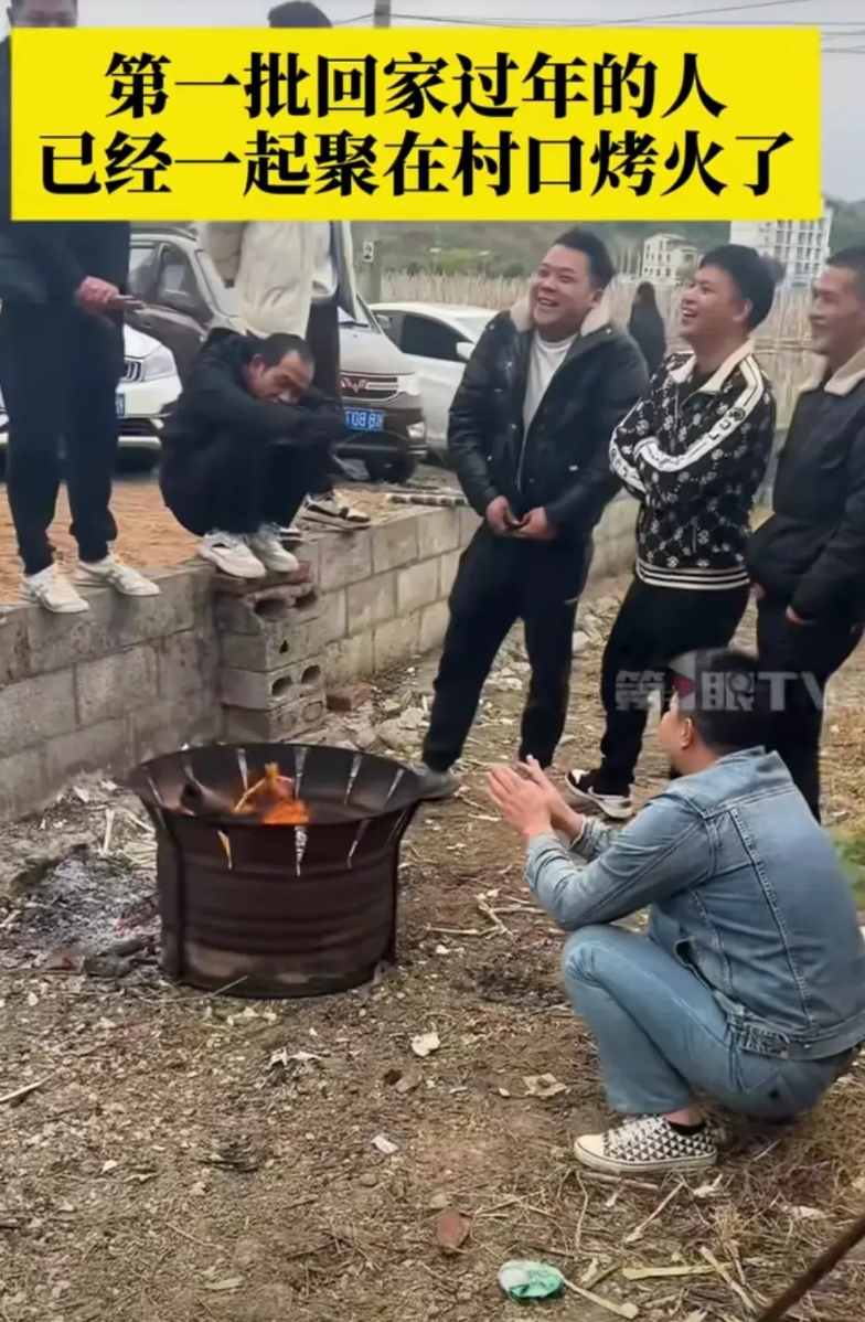 太搞笑了!广西柳州,第一批回家过年的人,已经聚在村口烤火了,但有一个搞笑的现象: