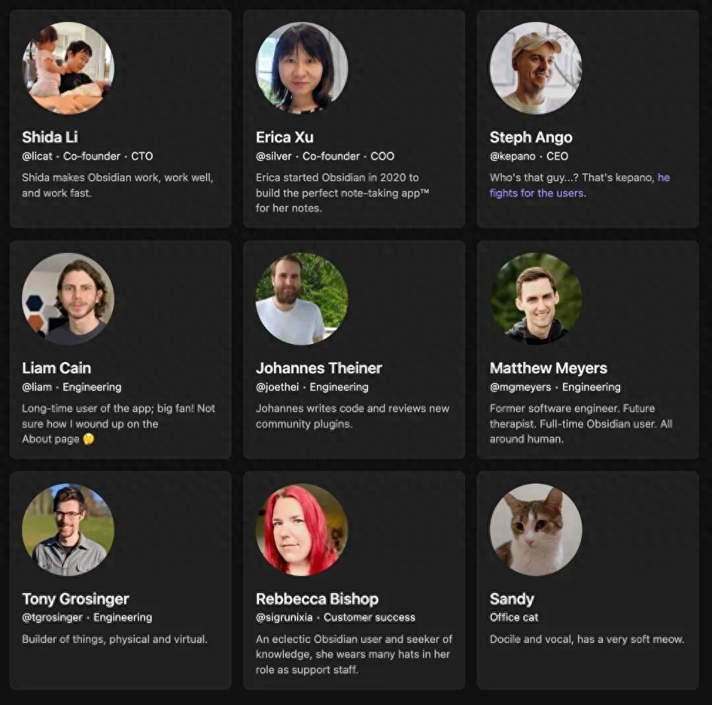 点进 Obsidian 官网的团队页面,你能看到一个 3*3 的排列就囊括了其所有成员。整个公司算上两位联合创始人、CEO、工程师和客服,除去已离职的 Matthew Meyers 总共 7 个全职员工,外加一只办公室猫 Sandy。这 7 个人支撑着一个月活超过 150 万的产品,年经常性收入估计在 2,500 万美元左右,估值约 3.5 亿美元。