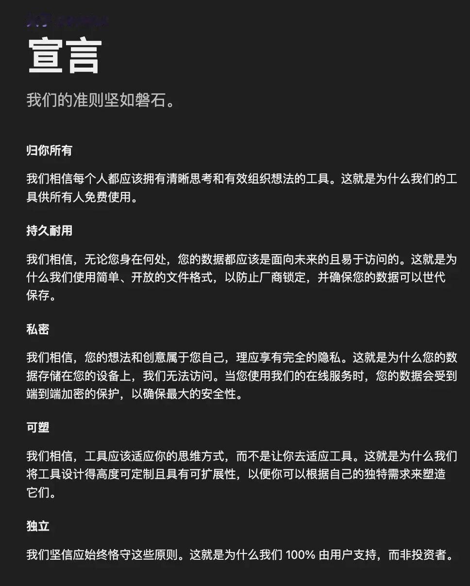 Ango 成为 CEO 后,Obsidian 的组织哲学被更清晰地表达了出来。2023 年 8 月,他在 X 上发了一条被广泛传播的帖子,宣布 Obsidian 的计划是“永远不超过 10 到 12 人,永远不接受风险投资,永远不收集用户数据和分析。继续以‘软件是短暂的,文件比应用更重要’的假设来构建产品。”