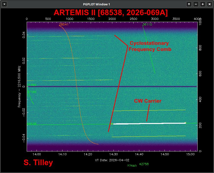 在“阿耳忒弥斯 2 号”发射后的次日午夜,飞船在特定时段升起。四位入选者之一的斯科特·蒂利(Scott Tilley,呼号 VE7TIL)从距离地球约 7.5 万公里的太空中,成功捕获了第一批无线电多普勒数据。在他的频率-时间图表上,飞船的信号呈现为一条形如“意大利面”的反 S 形下降橙色曲线。