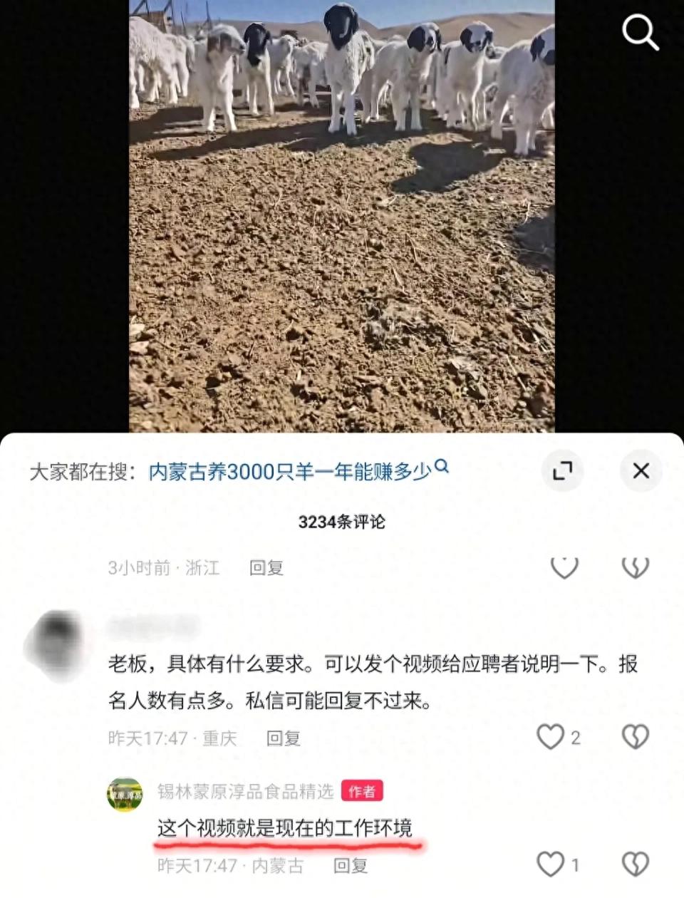 可还真不是。内蒙古锡林浩特一位左老板,正儿八经在社交平台发信息招人,管3000只羊,工资开到1.6万。消息一出,好家伙,电话差点被打爆,几百号人抢着报名,有人甚至从广东、湖南大老远打电话来问:“还招人吗?我能干!”