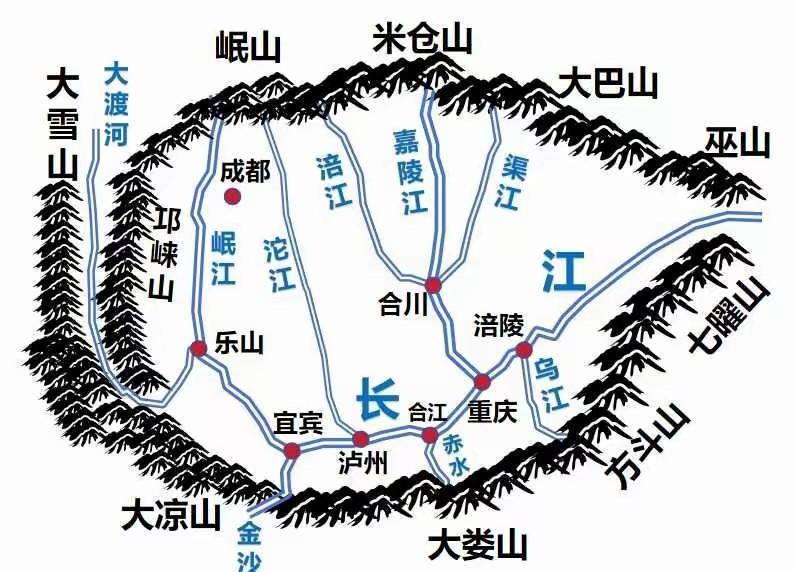 · 岷江:发源于岷山,自北向南纵贯成都平原,在乐山接纳大渡河,最终于宜宾汇入长江。