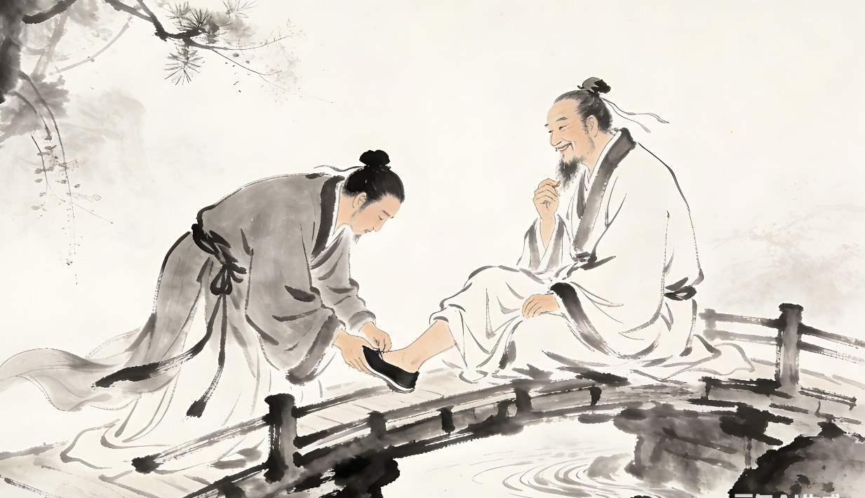 一天,一个穿粗布衣服的老人走到他面前,故意把鞋甩到桥下,转头对他说:“小子,下去把鞋捡上来!”