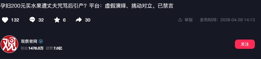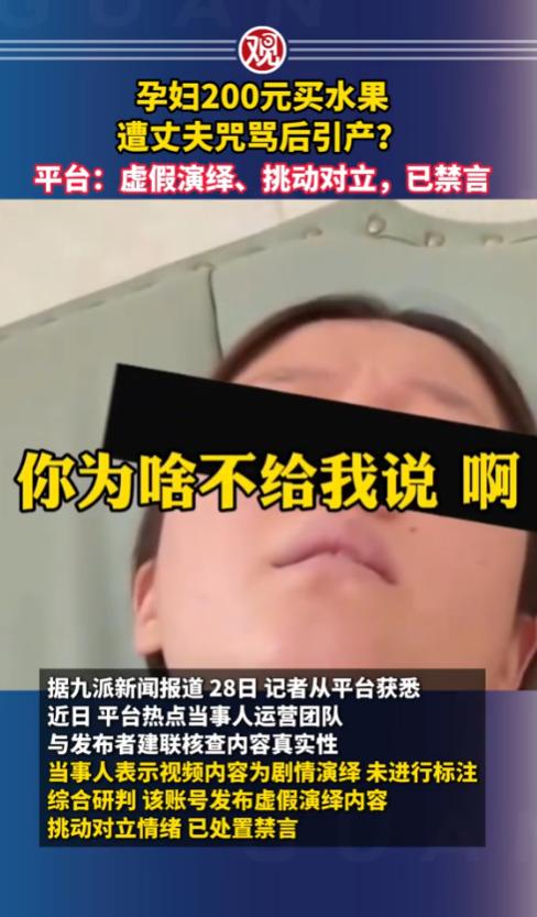 观察者网:孕妇200元买水果遭丈夫咒骂后引产?平台:虚假演绎、挑动对立,已禁言