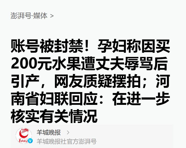澎湃新闻:账号被封禁!孕妇称因买200元水果遭丈夫辱骂后引产,网友质疑摆拍;河南省妇联回应:在进一步核实有关情况