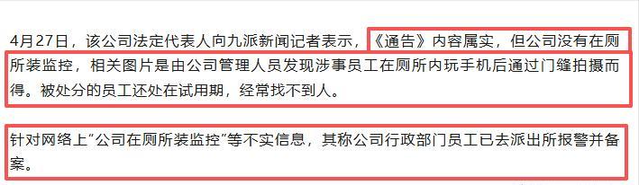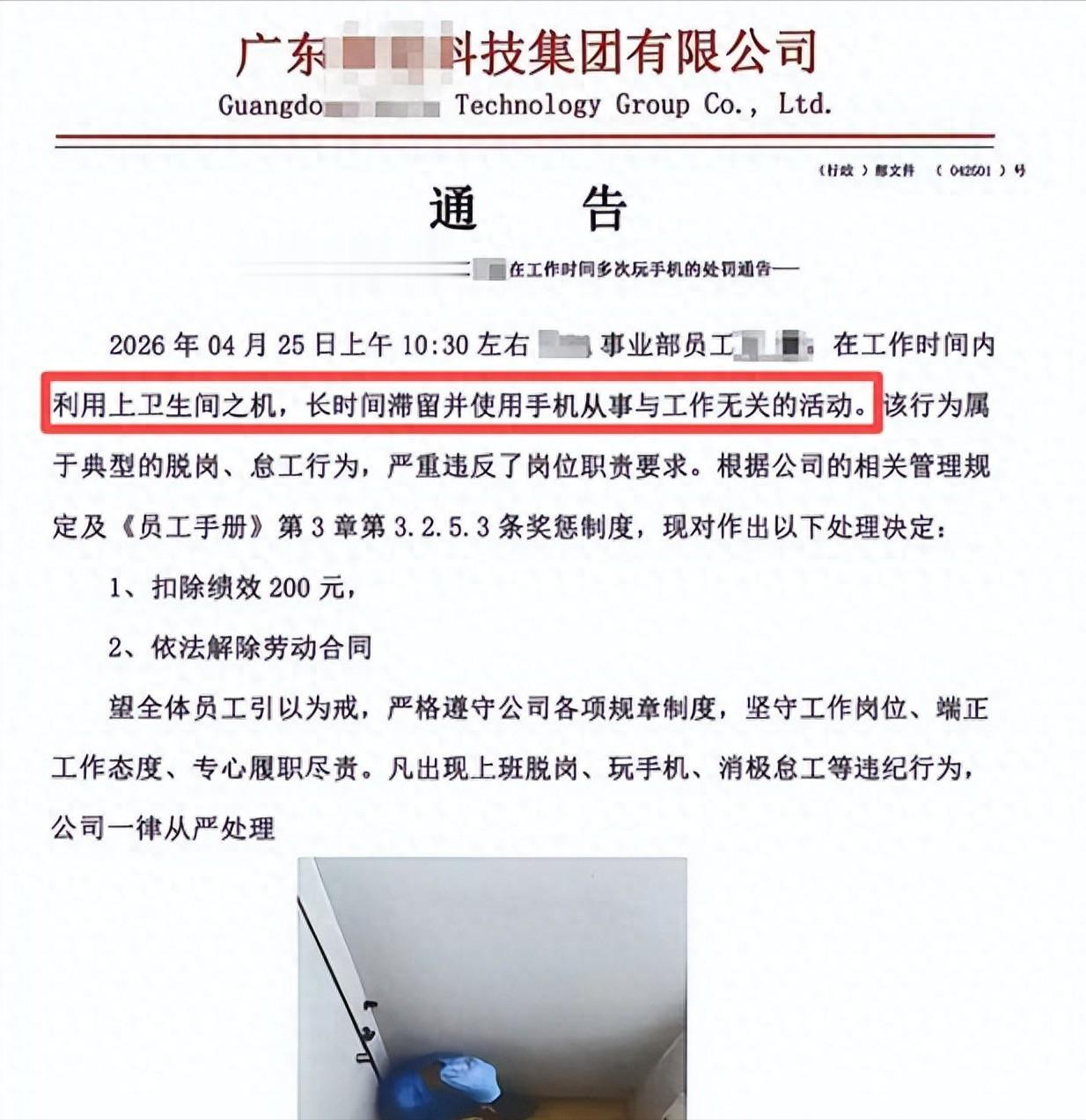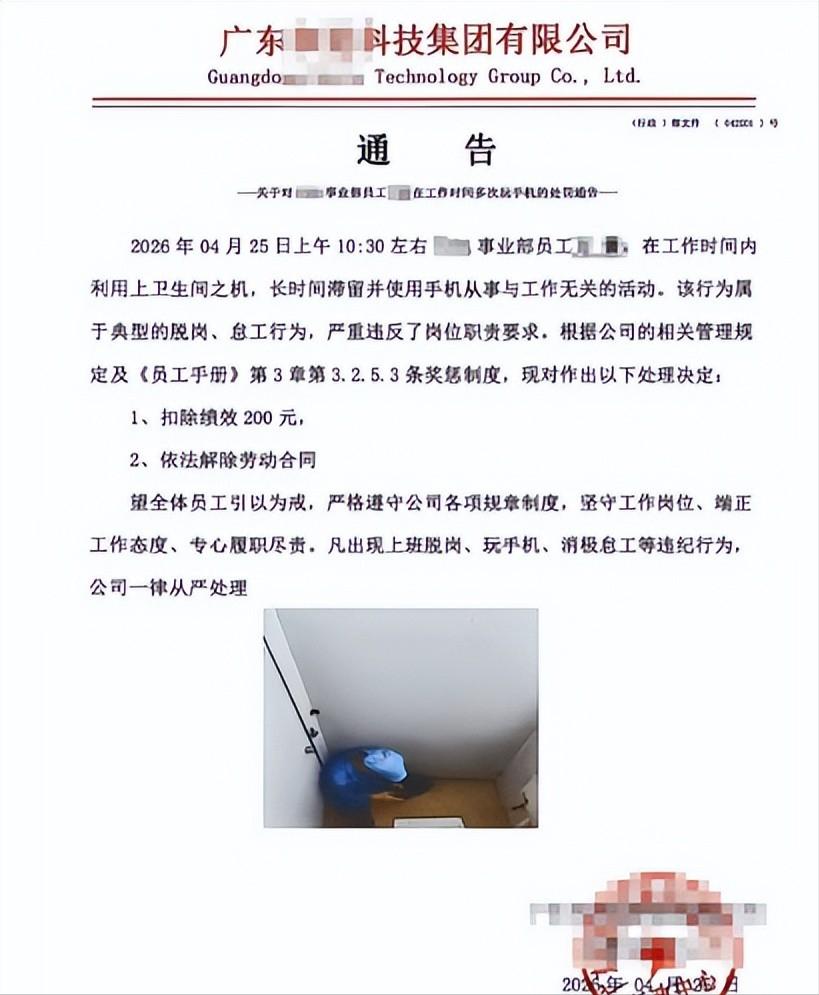 红星新闻-2026-04-28-广东一员工在厕所长时间玩手机被开除,照片被展示在通告内,公司回应:其在试用期时常找不到人,厕所没装监控,管理人员发现后门缝拍的