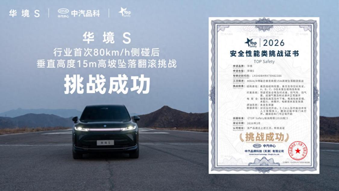 当高速侧撞与坠坡翻滚两大致命事故叠加,乘员能否安然无恙?2026年3月25日,上汽通用五菱与华为深化战略合作的首款旗舰——华境S,公布行业首次“80km/h侧碰后垂直高度15m高坡坠落翻滚” 极限挑战成果,凭借硬核安全实力成功通关 “超纲大考”,斩获中汽品科 TOP Safety 安全性能证书,重新定义大六座 SUV 安全新标杆。