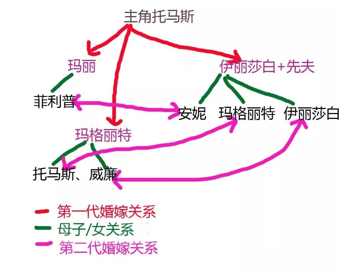 这部分我给大家画了示意图,托马斯儿子都是亲生的,图中省略了他第二任生的两个闺女