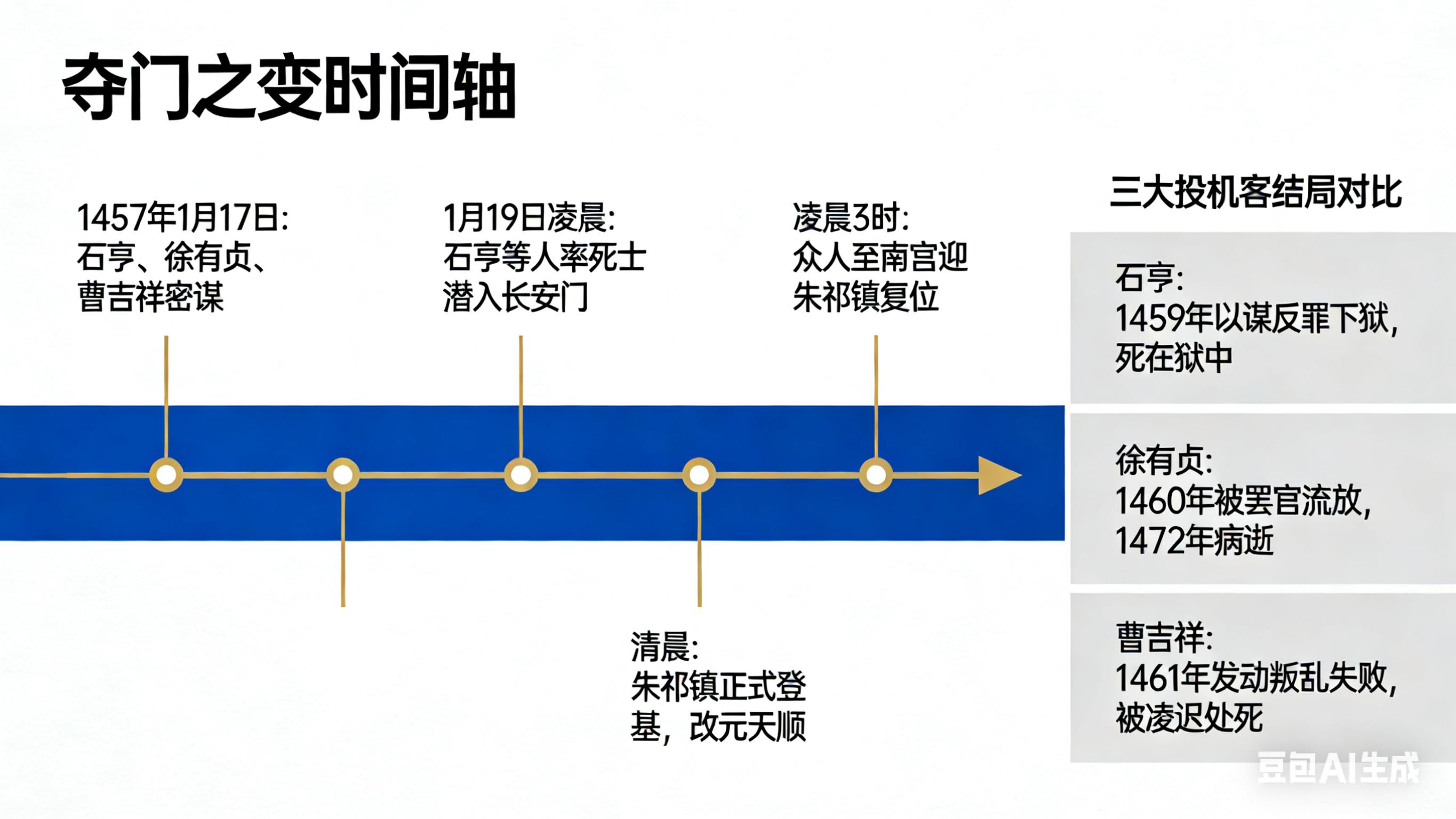 5. 卯时三刻(05:45):鸣钟鼓召百官。群臣入殿,见龙椅上是太上皇,面面相觑。徐有贞高呼:“太上皇复辟矣!” 百官被迫跪拜,政变成功。