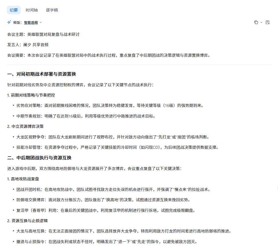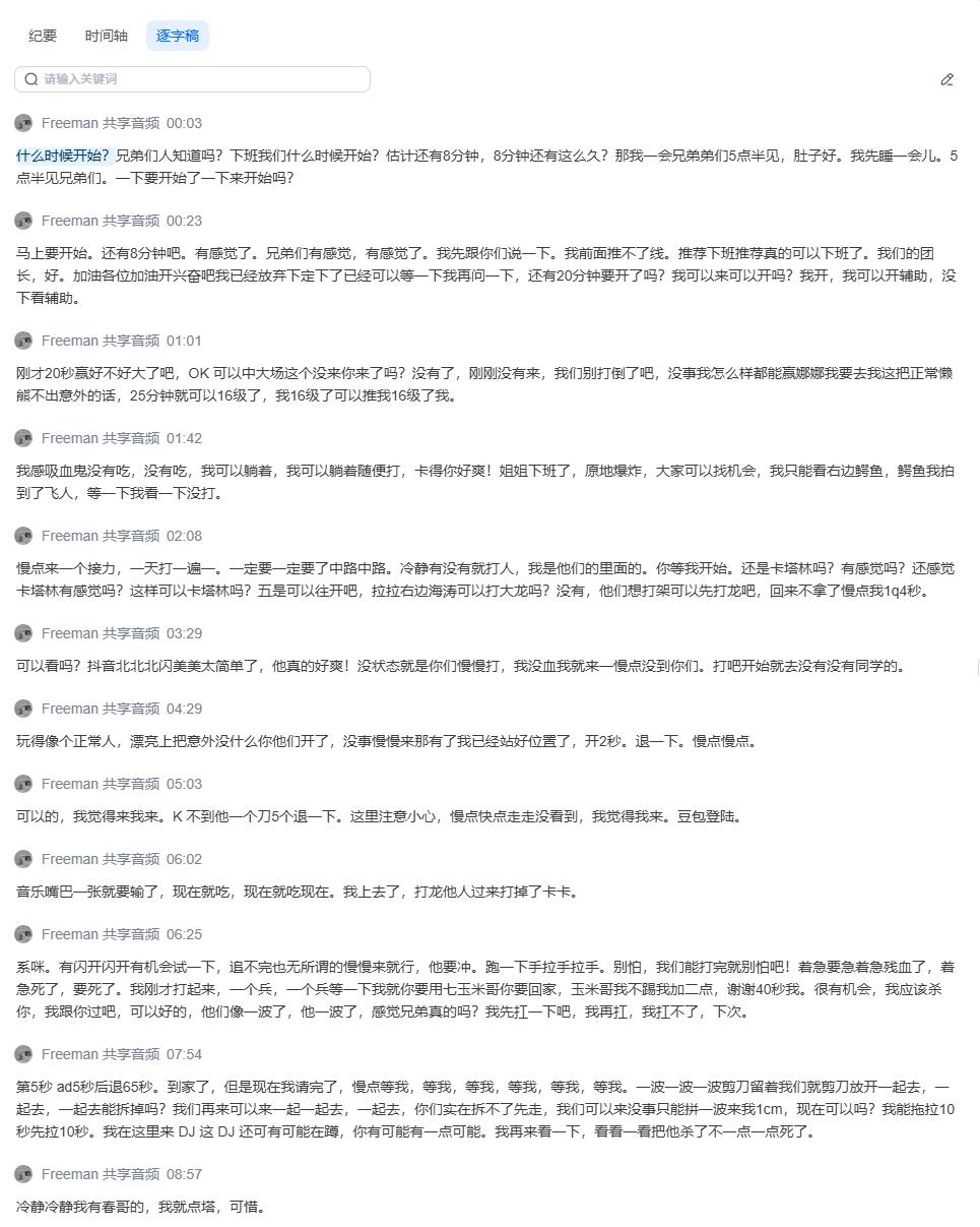就我自己而言,也习惯了在跟朋友打游戏时顺带开着腾讯会议,几个小时下来,它会生成一份「会议纪要」,上面一本正经地记录着诸如「某人36次提出缺奶问题」「某人对队友操作提出批评性发言」这些细节,发到群里讨论,节目效果拉满。