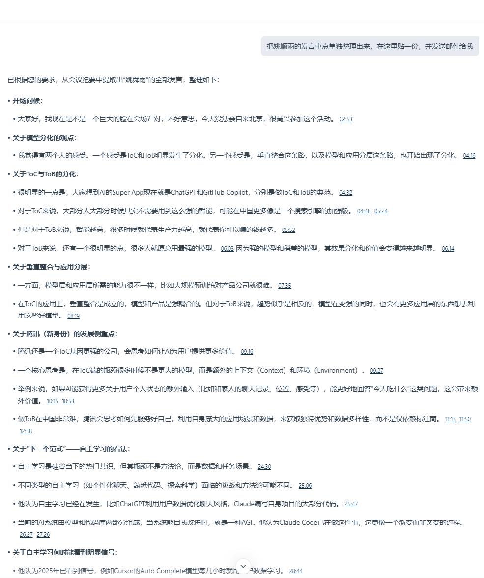 更加个性化的,是你能直接根据会议原文追问元宝,让它直接输出最符合心意的会议内容,比如对某人的发言特别感兴趣,就可以通过元宝进行一键总结,甚至让它帮你生成一封跟进邮件。