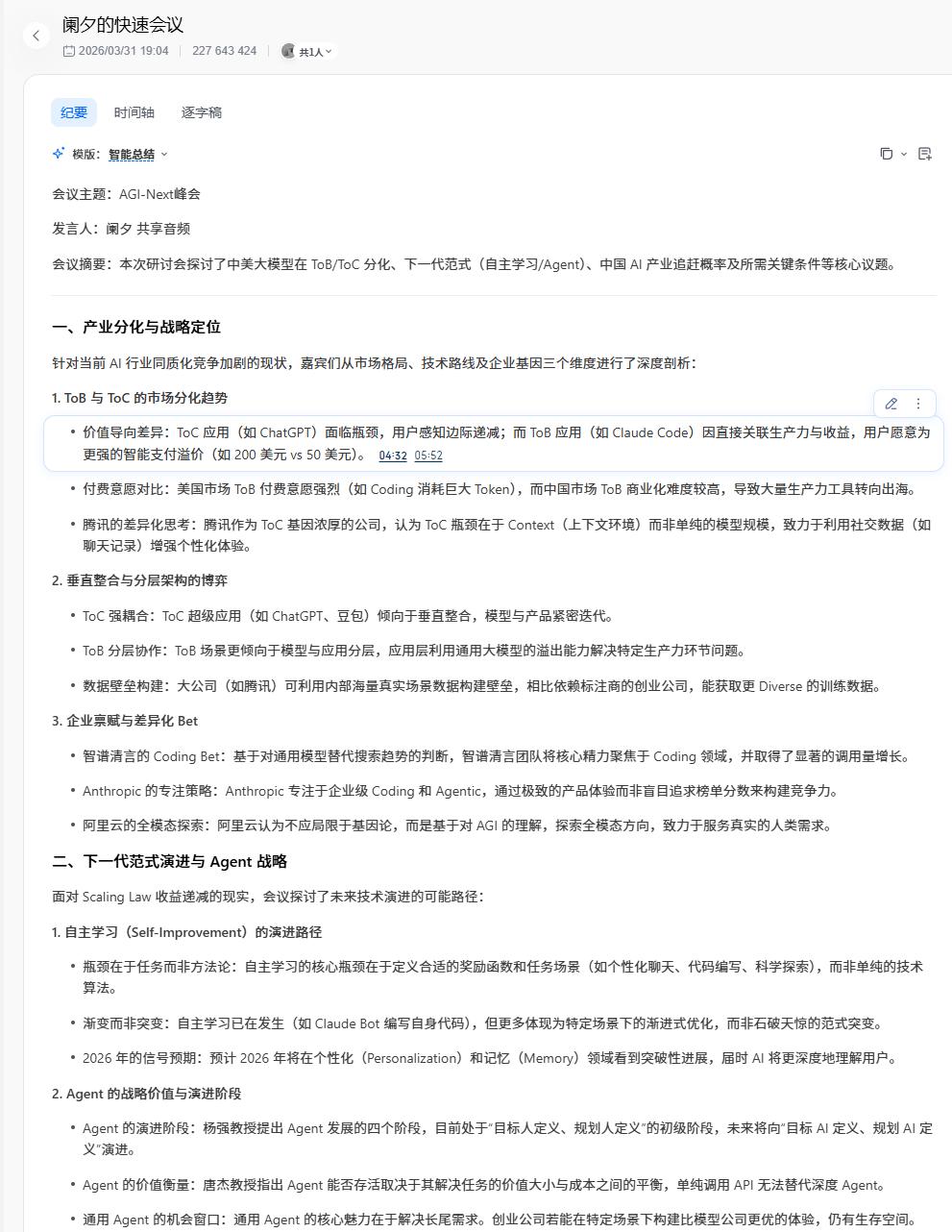 用户可以在纪要中的任意位置插入批注——突发灵感、主观判断、纠错直觉——这些笔记会跟会议内容长在一起,让会议资产随着人类的思考持续生长。