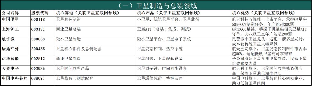 领域简介:产业链上游核心环节,负责低轨卫星平台、卫星载荷的研发、总装与集成测试,是低轨星座规模化组网的基础,技术壁垒高、订单确定性强,主要由国家队主导,民营企业逐步参与补充,核心需求来自GW星座、千帆星座等国家级项目。