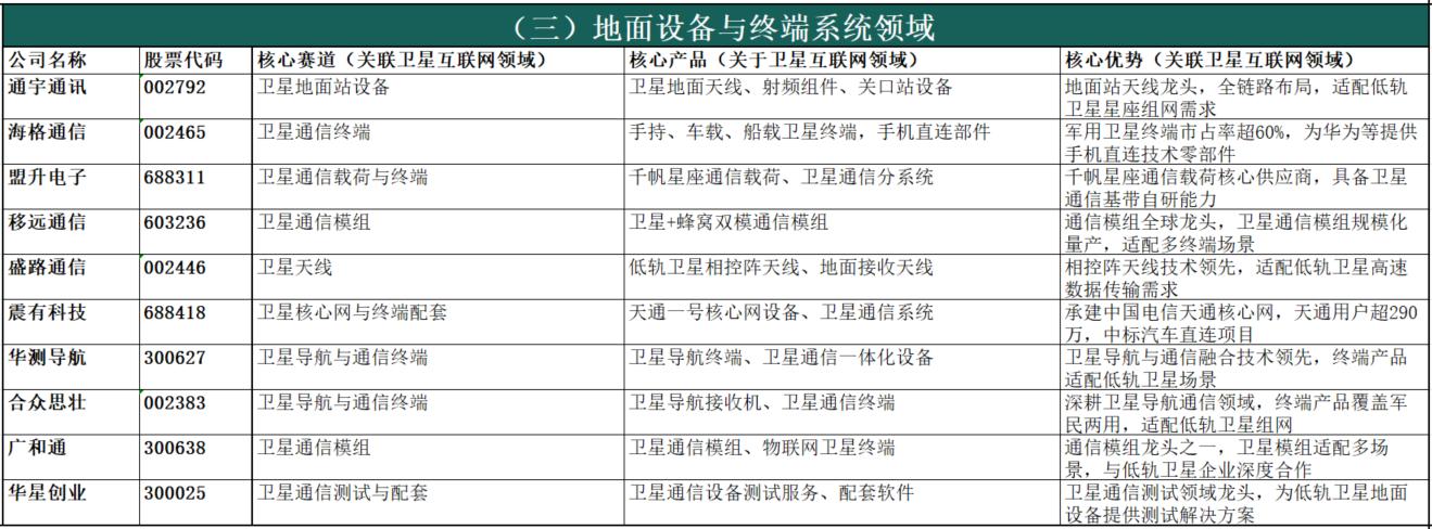 领域简介:连接卫星与用户的关键枢纽,属于产业链中游,涵盖地面信关站、接收天线、手持/车载/船载终端、卫星通信模组等,是卫星互联网商业化落地的核心载体,随着手机直连卫星等场景普及,市场增速显著。