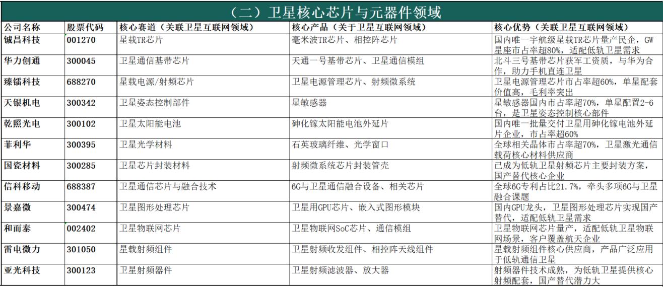 领域简介:卫星互联网的“核心心脏”,涵盖星载TR芯片、基带芯片、电源管理芯片、射频组件、太阳能电池、光学材料等,直接决定卫星通信性能与制造成本,是实现核心技术自主可控的关键环节,国产替代需求迫切。