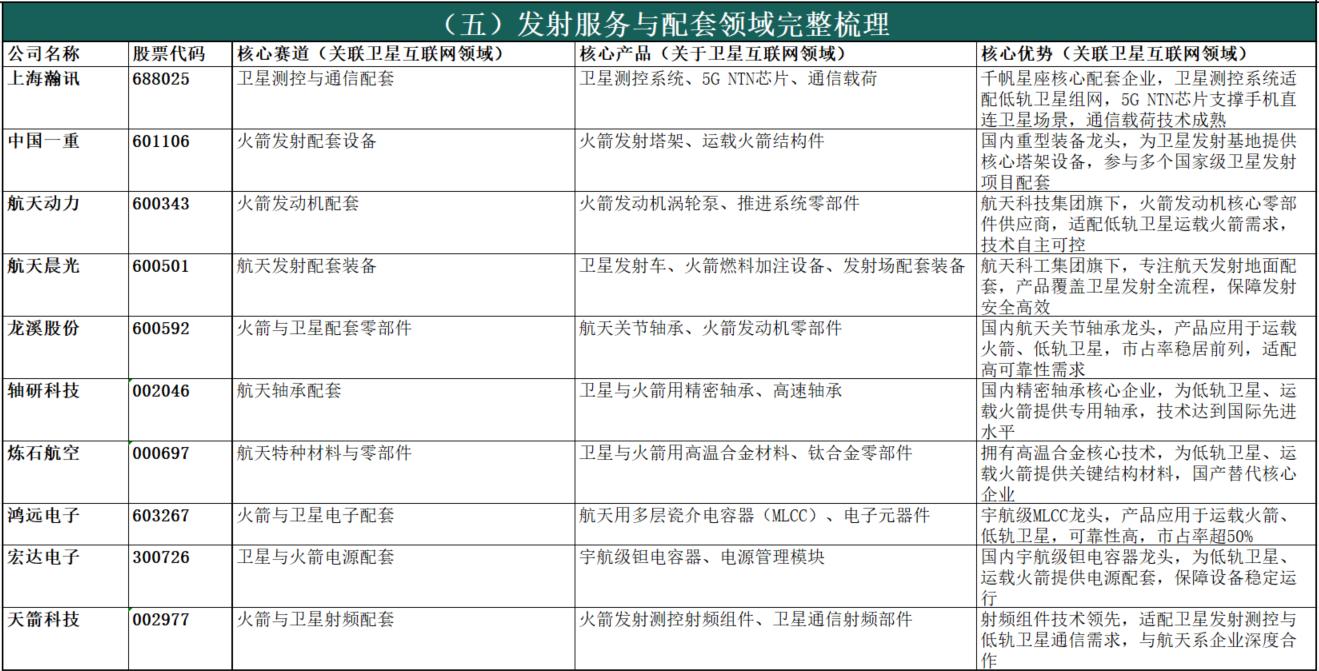 领域简介:支撑卫星入轨的关键环节,属于产业链上游,涵盖运载火箭制造、发射服务、火箭与卫星配套零部件、测控系统等,低成本、高频率发射是低轨星座规模化部署的核心前提,主要由航天系企业主导,民营企业逐步参与配套。