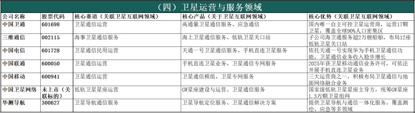 领域简介:产业链下游核心环节,负责卫星网络运营、频谱管理、用户服务及应用落地,拥有稀缺的卫星运营牌照,现金流稳定,是卫星互联网产业价值兑现的关键,主要以国家队为主,民营企业聚焦细分服务领域。