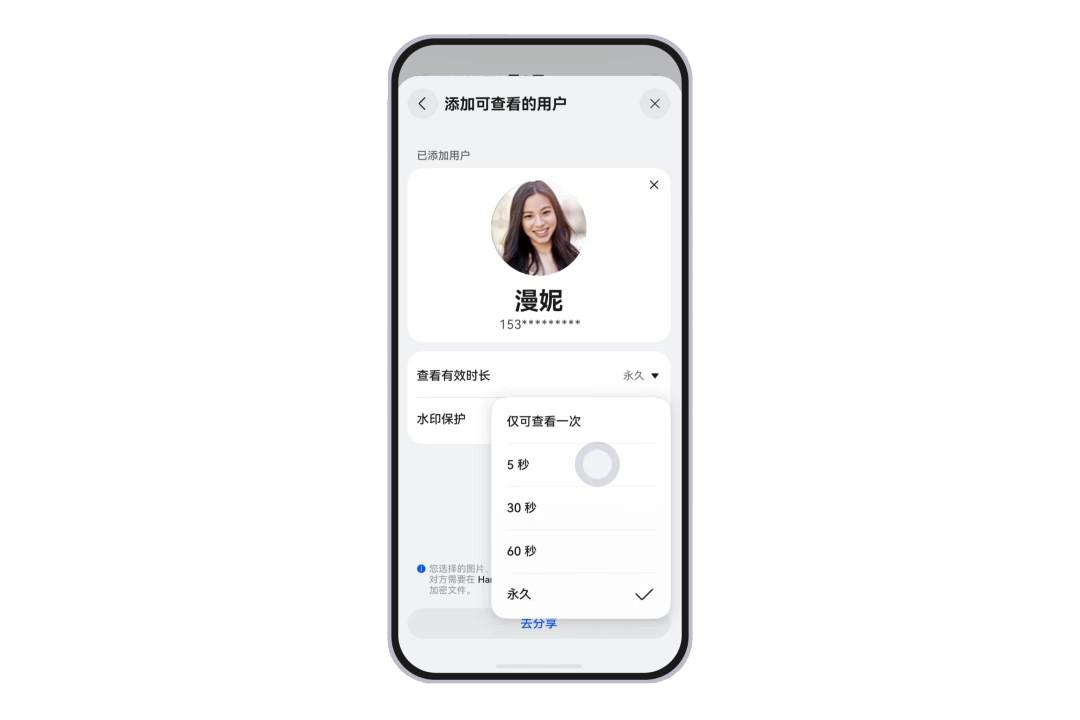 备受用户好评的“加密分享”功能再升级,新增限时查看和添加水印功能。在加密分享文件、图片、视频时,用户可设置“查看有效时长”,比如查看有效时长设置为 5 秒,收到文件的用户打开文件只有 5 秒查看时间,5秒后文件将被销毁,无法继续查看,也无法转发给别人。分享加密文件时打开“水印保护”开关还可以自动对文件设置水印,可有效防止加密文件被滥用,降低泄密风险。