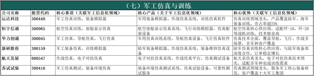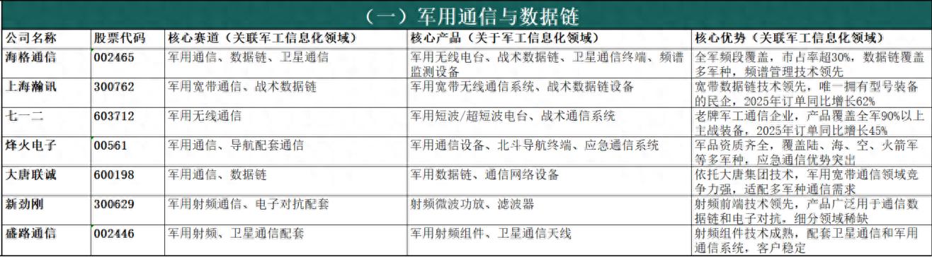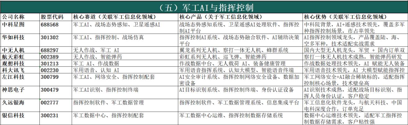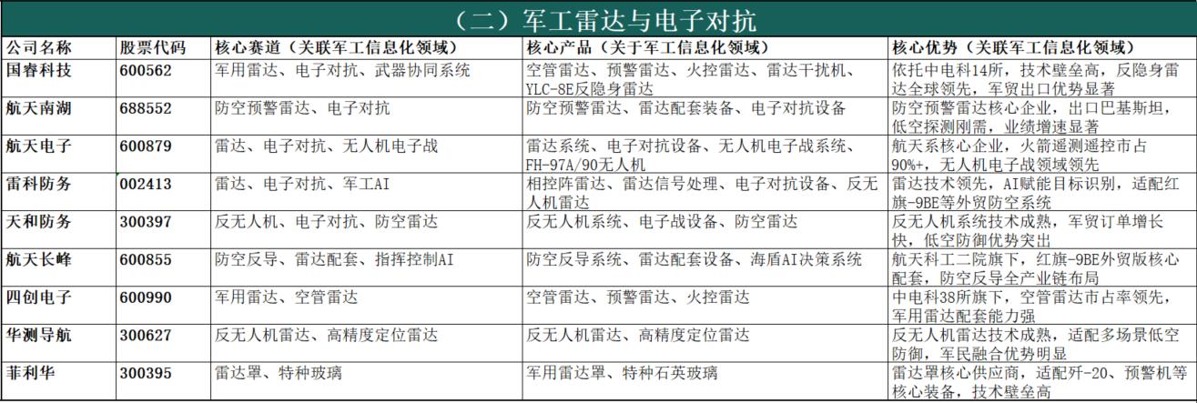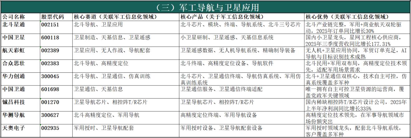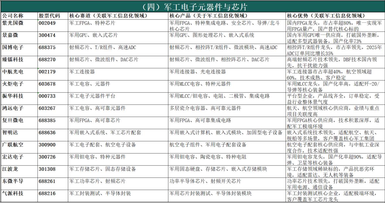 政策顶层设计明确赋能:十五五规划明确提出“统筹网络信息体系建设运用,加强数据资源开发利用,构建智能化军事体系”,将无人智能作战力量、网络信息体系列为核心建设方向,为行业发展提供清晰政策指引。新质战斗力建设刚需:现代战争已进入“算法制胜、智能破局”的信息化战争时代,军工信息化是武器装备的“眼睛、耳朵、大脑”,是联合作战、全域作战的核心支撑,直接决定战场主动权,是新质战斗力建设的核心载体,刚需属性突出。国防预算持续倾斜保障:我国国防预算连续多年保持7%以上稳定增长,2025年达1.67万亿元,十五五期间将持续向信息化、智能化装备倾斜,装备采购资金重点投向通信、雷达、芯片、AI、无人装备等领域,为行业长期发展提供稳定资金保障。国产替代战略迫切性凸显:当前国际技术封锁加剧,军工信息化领域核心芯片、元器件、软件等“卡脖子”问题突出,全产业链自主可控是保障国家安全的刚性需求,十五五期间国产替代将进入攻坚阶段,带来巨大市场空间。军民融合双向赋能增效:十五五规划提出“民参军”绿色通道,简化准入流程、推动军民标准通用化,民用AI、大数据、卫星互联网等技术向军用转化,提升装备智能化水平;同时军用技术反哺民用领域,形成“军用牵引、民用支撑”的双向赋能格局,进一步拓宽行业发展空间。四、军工信息化细分领域及A股上市公司统计(按细分领域分类,先简介后表格)