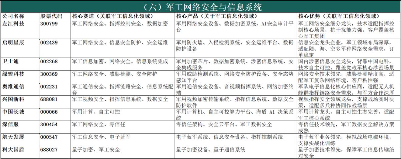 军工信息化产业链涵盖感知、传输、处理、应用、防护全链路,分为6大核心细分领域,以下按“领域简介+单独表格”形式呈现,表格严格遵循“公司名称、股票代码、核心赛道、核心产品、核心优势”表头,全面覆盖A股相关概念股,确保无遗漏、无冗余。