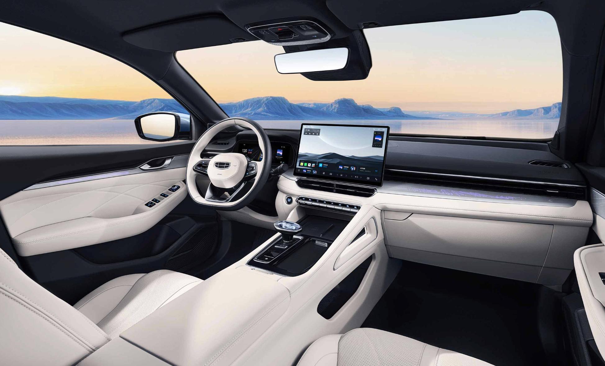 内饰方面,星瑞i-HEV智擎混动采用天山润白配色,辅以256色氛围灯和皮质包覆。车内配备10.2英寸全液晶仪表+14.6英寸中控屏,搭载Flyme Auto智能座舱系统,内置高通骁龙8155芯片,支持HiCar、Carlink、Flyme link互联生态。舒适性配置同样丰富,配备香氛系统、16扬声器音响(含头枕音响)、前排座椅通风/加热以及50W无线充电等。
