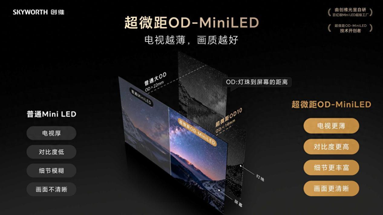 超微距OD技术带来的不只是电视形态的突破,更是一场对画质的“底层革新”。OD缩短后,背光光线会被聚拢,这一改变能够直接提升画面亮度,使对比度和光影层次感更加分明,同时还能大幅削弱亮部区域周围的光线溢出现象,无论显示人物还是景物,都会更加清晰立体,不会出现光晕遮挡和融色的问题;搭载超微距OD 6技术的创维A10H系列,光晕减少高达72.7%。只有画面提亮了、更干净了,才能看什么都真实。