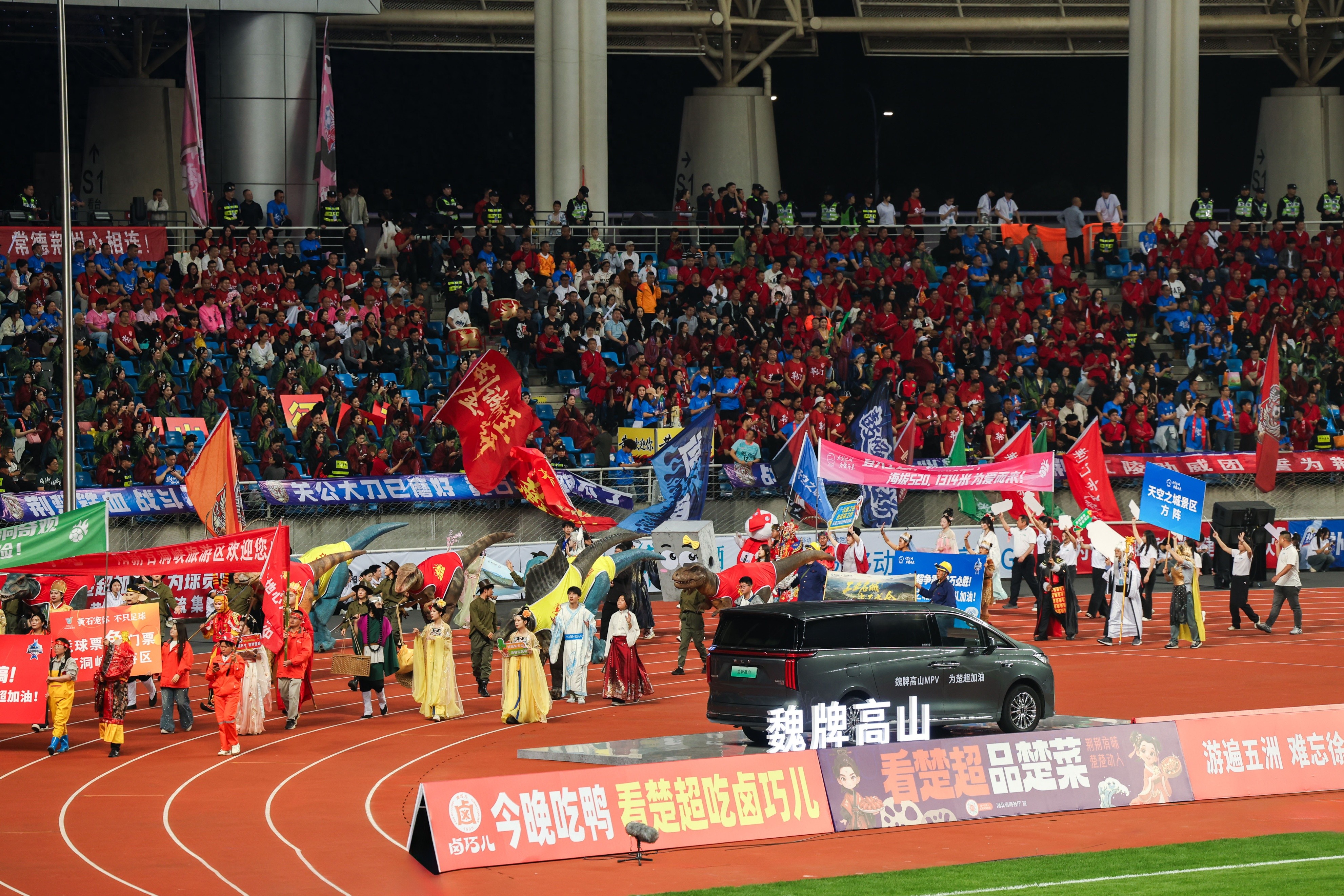 4月12日晚,湖北奥体中心,首届楚超联赛揭幕战在3.2万名观众的欢呼声中火热开赛。而在球场的聚光灯之下,除了绿茵场上的球员们,另一个“选手”同样抢足了风头——从环绕大屏到观众席,从后备箱市集到巨型Tifo,魏牌高山的元素几乎承包了整座场馆的视觉焦点。
