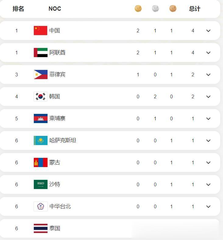 我国获得2金1银1铜,共计4枚奖牌排第一。阿联酋也获得2金1银1铜,与我国并列第一。