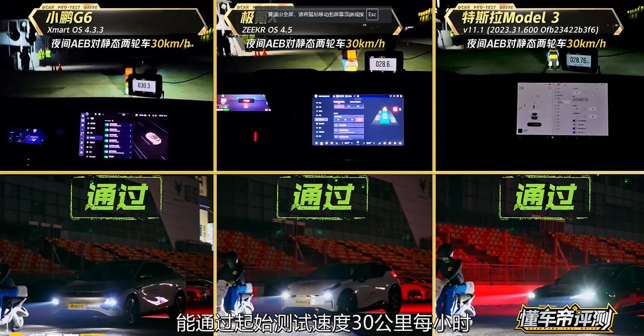 小鹏G6、极氪X、特斯拉model3通过30km/h刹停测试;